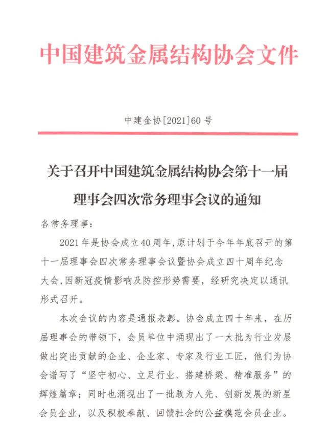 关于召开中国建筑金属结构协会第十一届理事会四次常务理事会议的通知