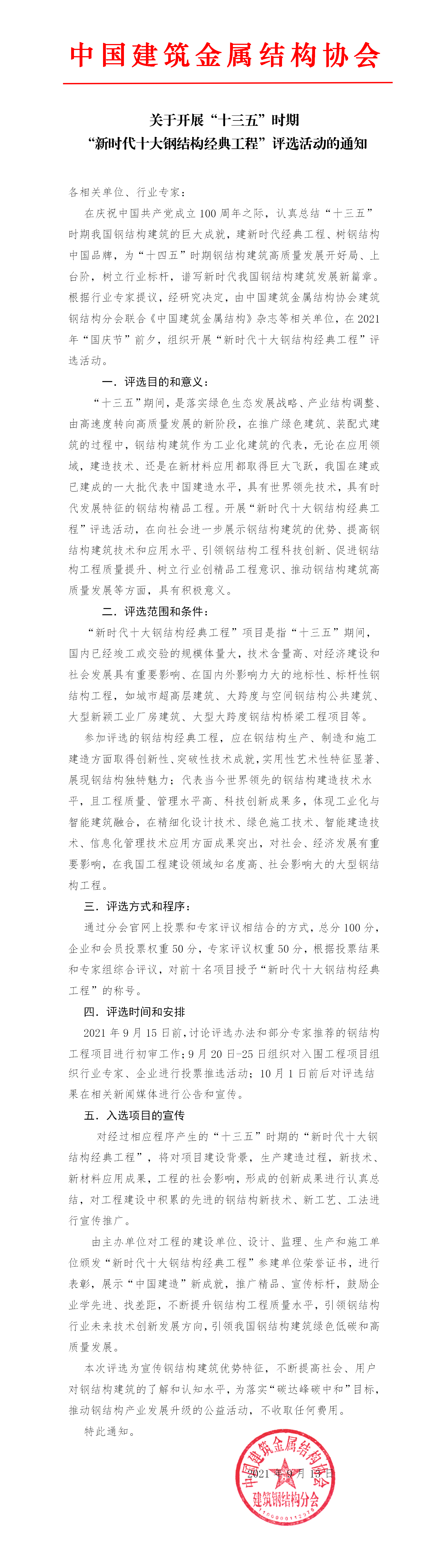 关于开展“十三五”时期 “新时代十大钢结构经典工程”评选活动的通知