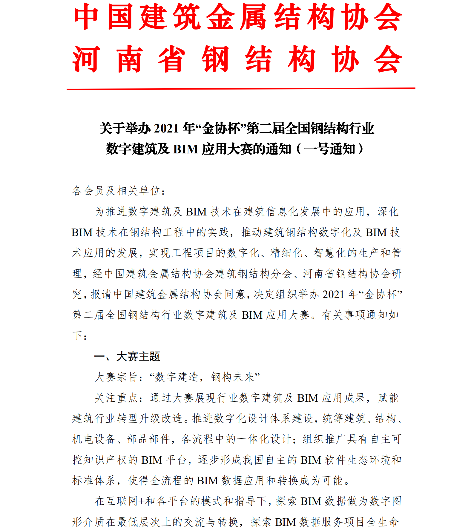 关于举办 2021 年“金协杯”第二届全国钢结构行业 数字建筑及 BIM 应用大赛的通知(一号通