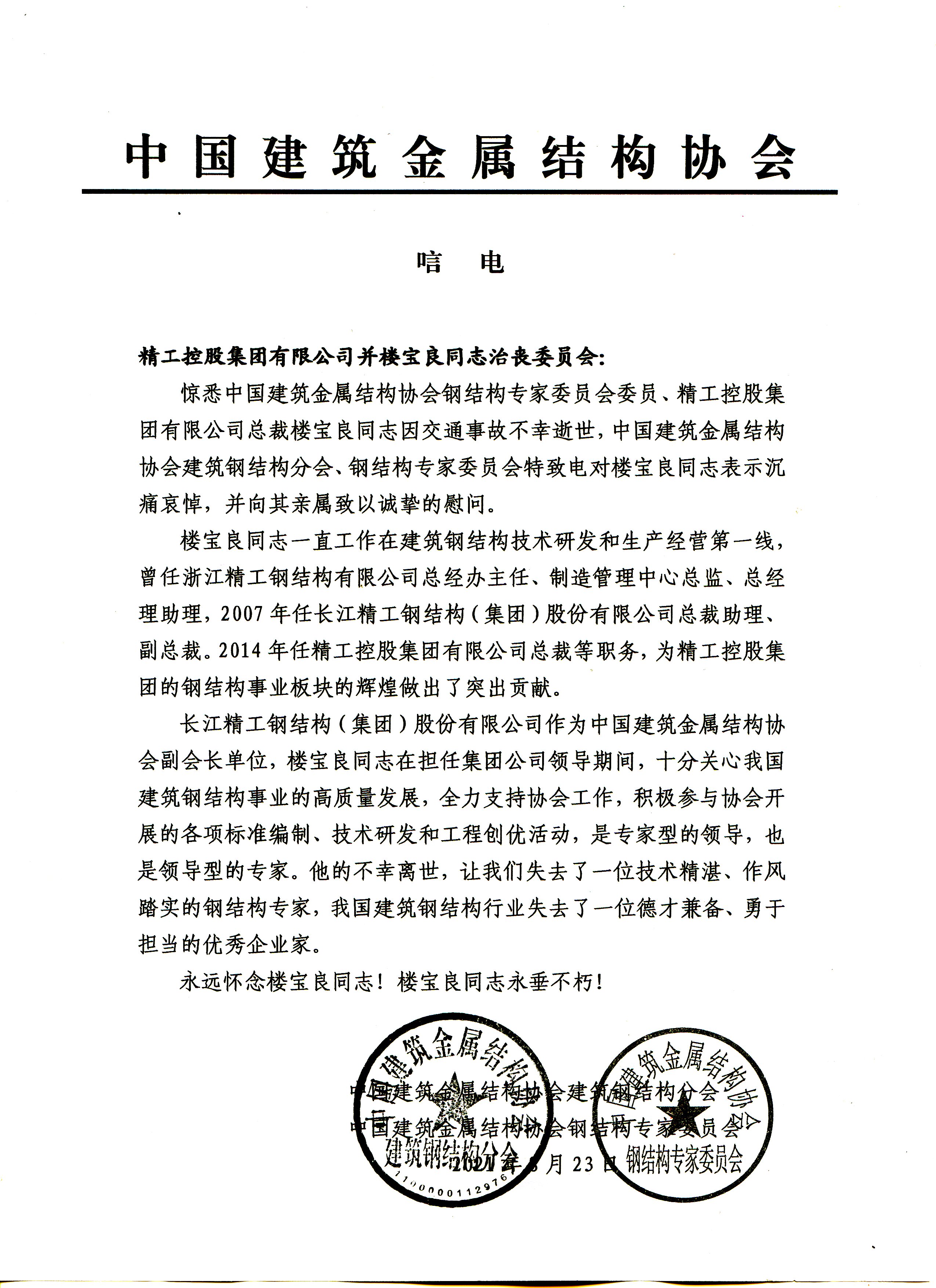 唁电-沉痛悼念钢结构专家委员会专家楼宝良同志