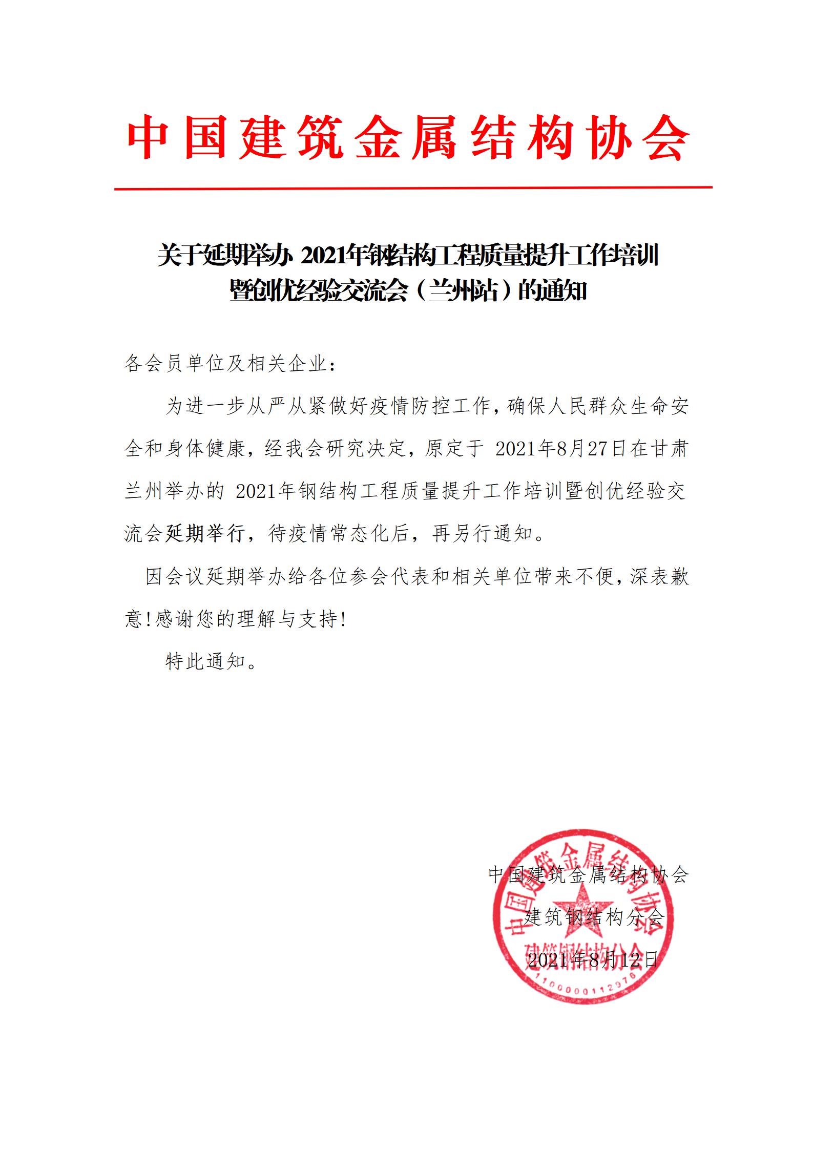 关于延期举办 2021年钢结构工程质量提升工作培训 暨创优经验交流会(兰州站)的通知
