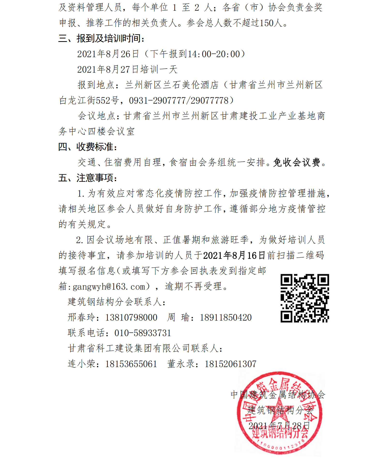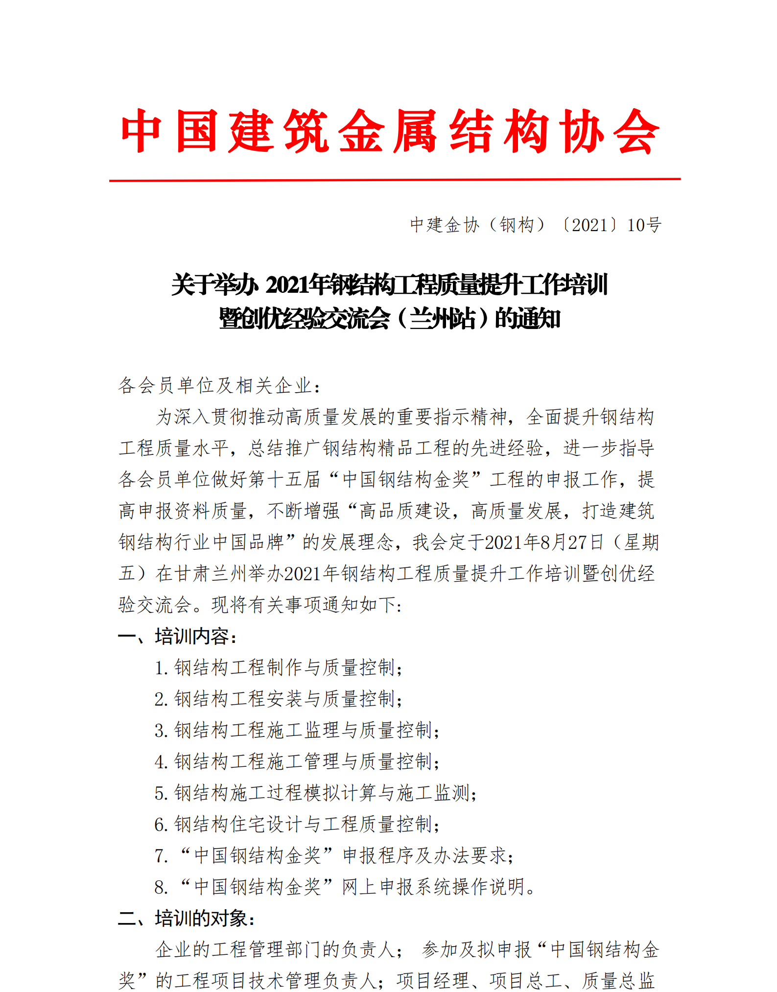 关于举办 2021年钢结构工程质量提升工作培训 暨创优经验交流会(兰州站)的通知