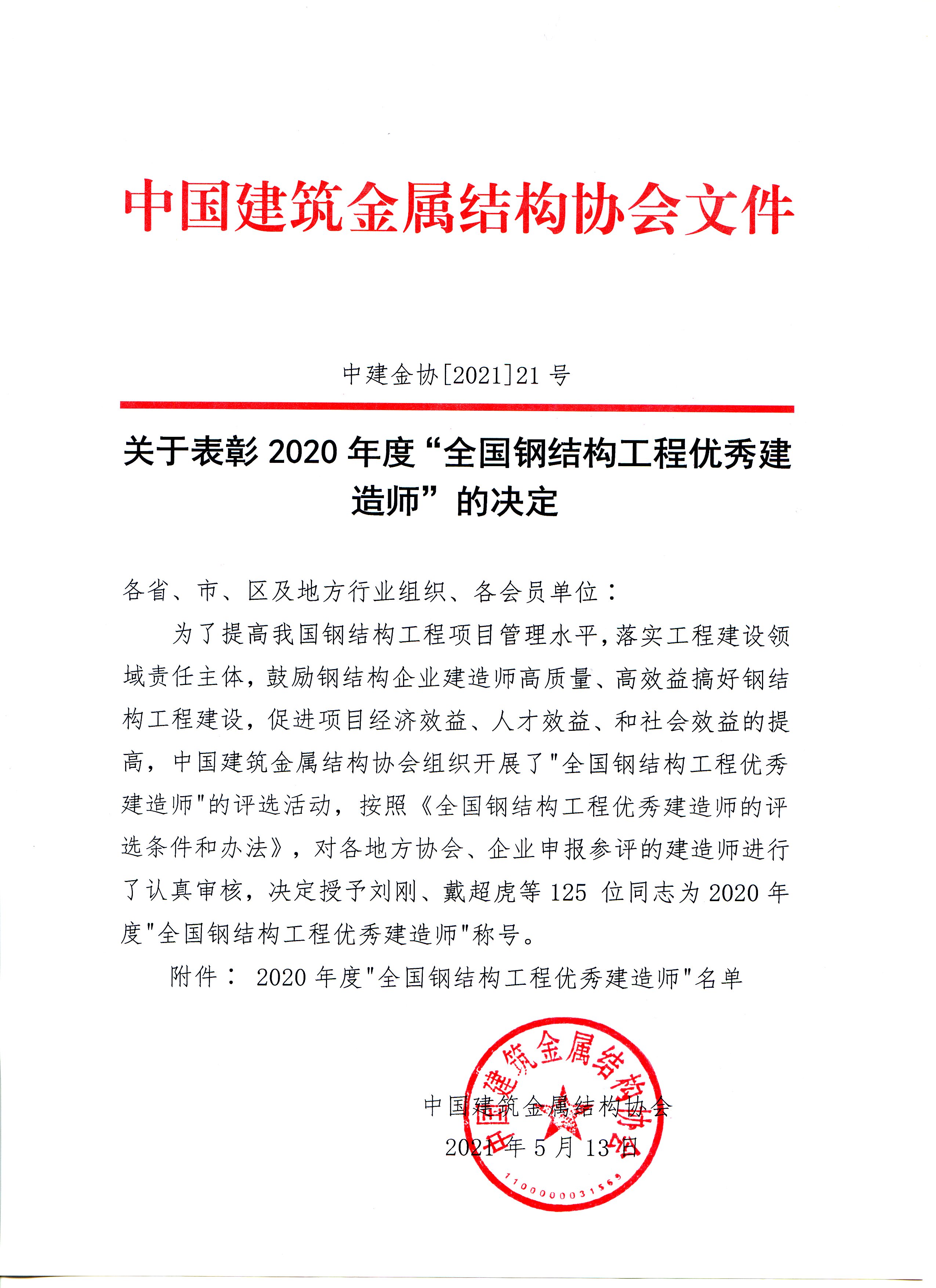 关于表彰2020年度《全国钢结构工程优秀建造师》的决定