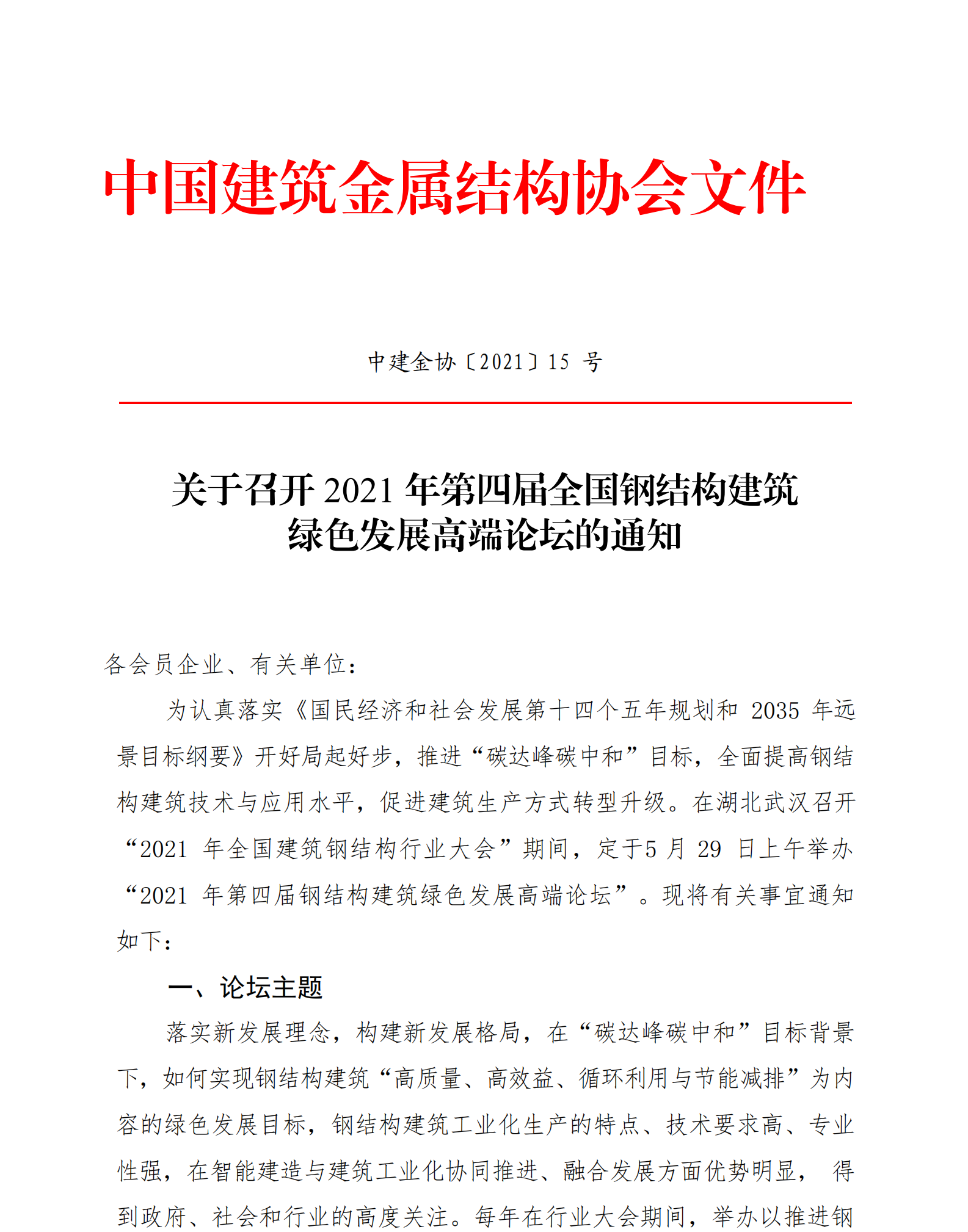 关于召开2021年第四届全国钢结构建筑绿色发展高端论坛的通知