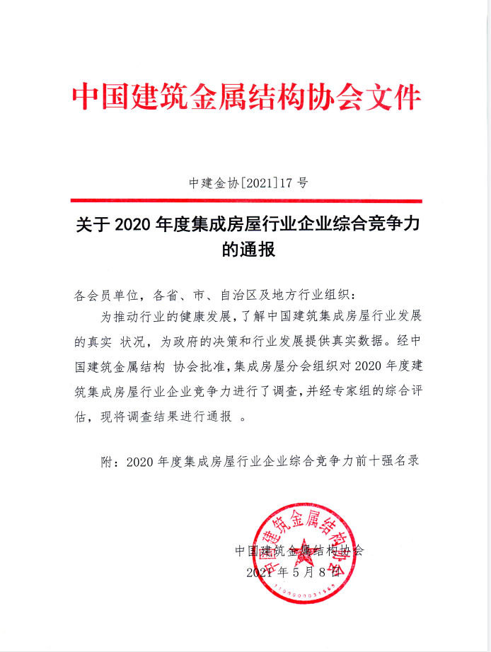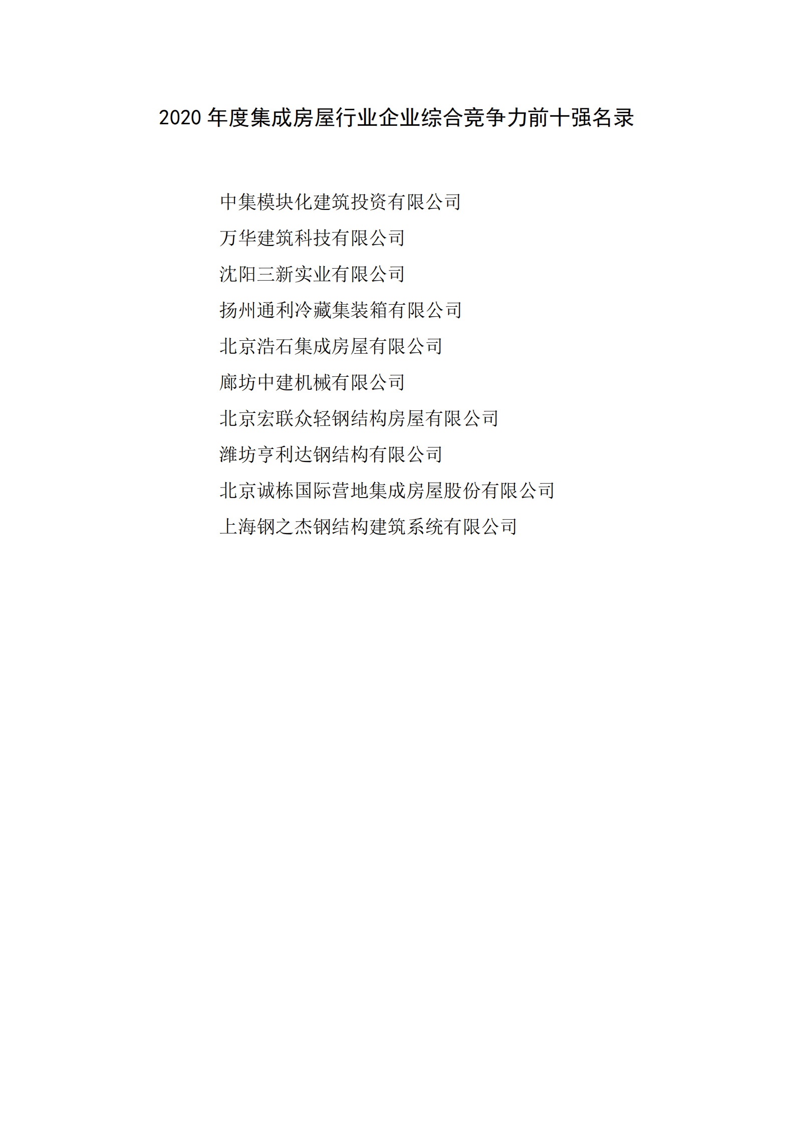 关于2020年度集成房屋行业企业综合竞争力的通报
