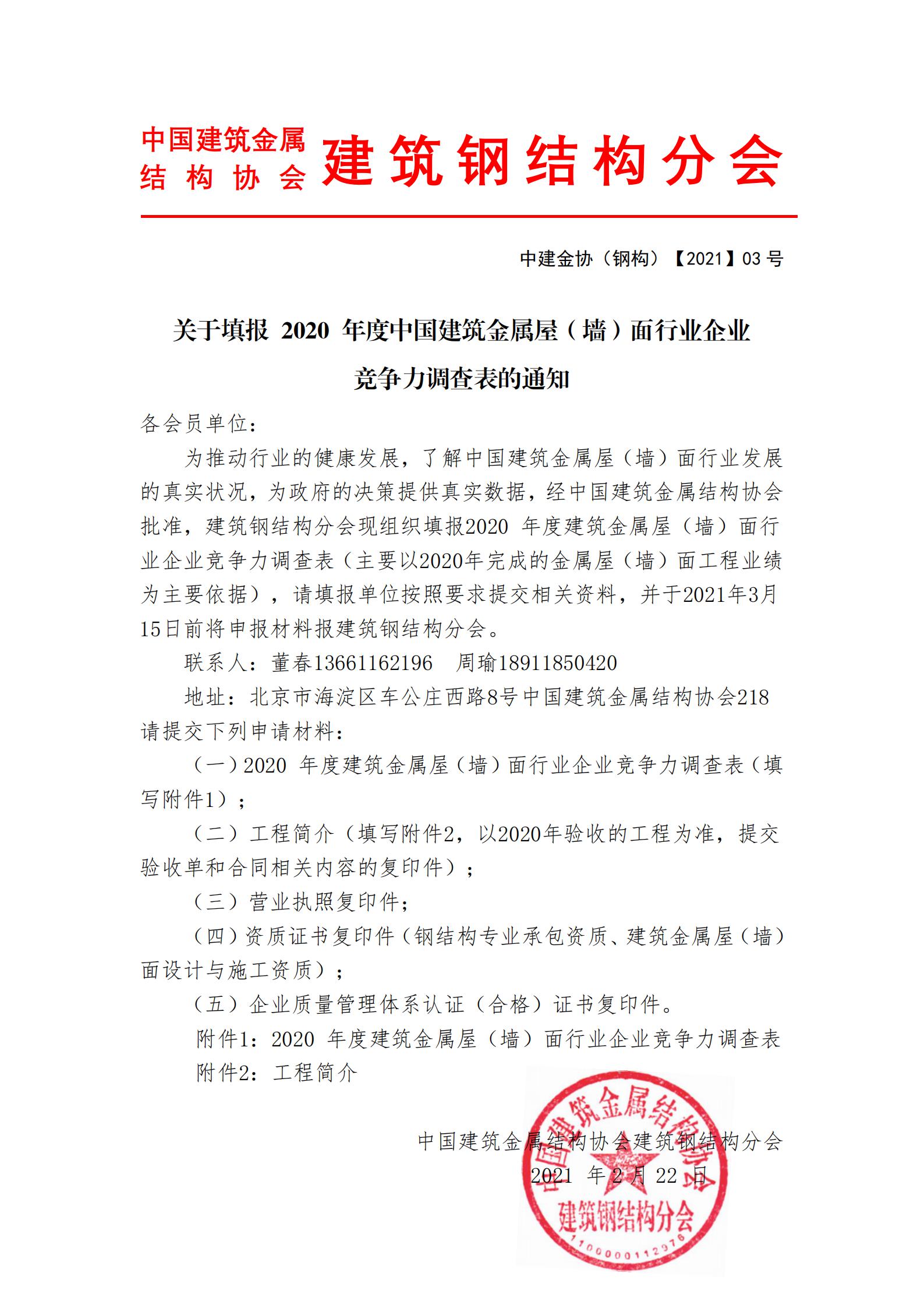 关于填报 2020 年度中国建筑金属屋(墙)面行业企业竞争力调查表的通知