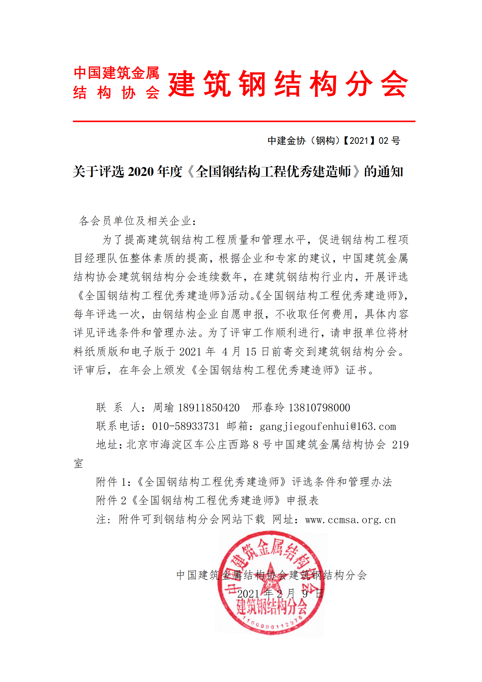 关于评选2020年度《全国钢结构工程优秀建造师》的通知