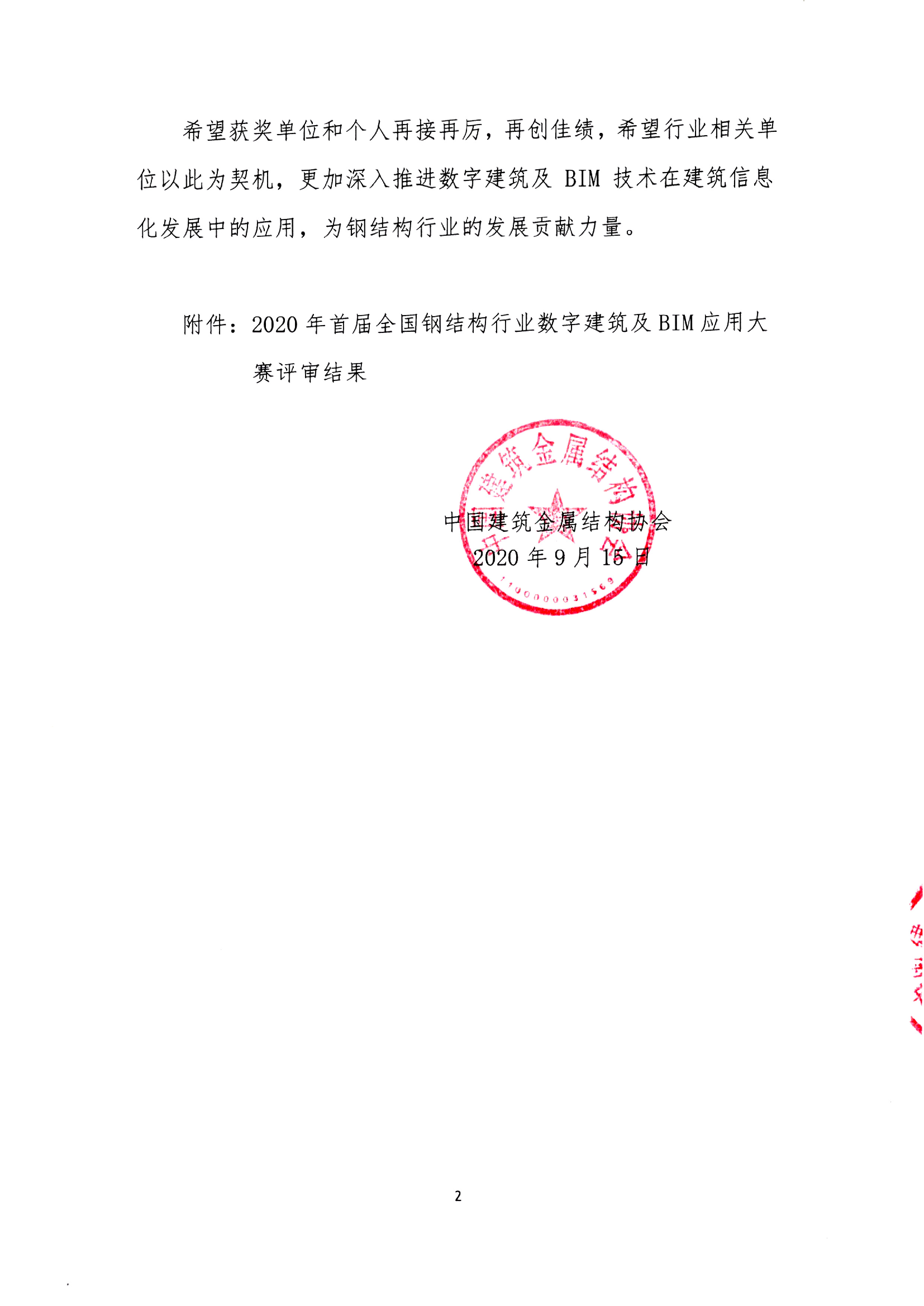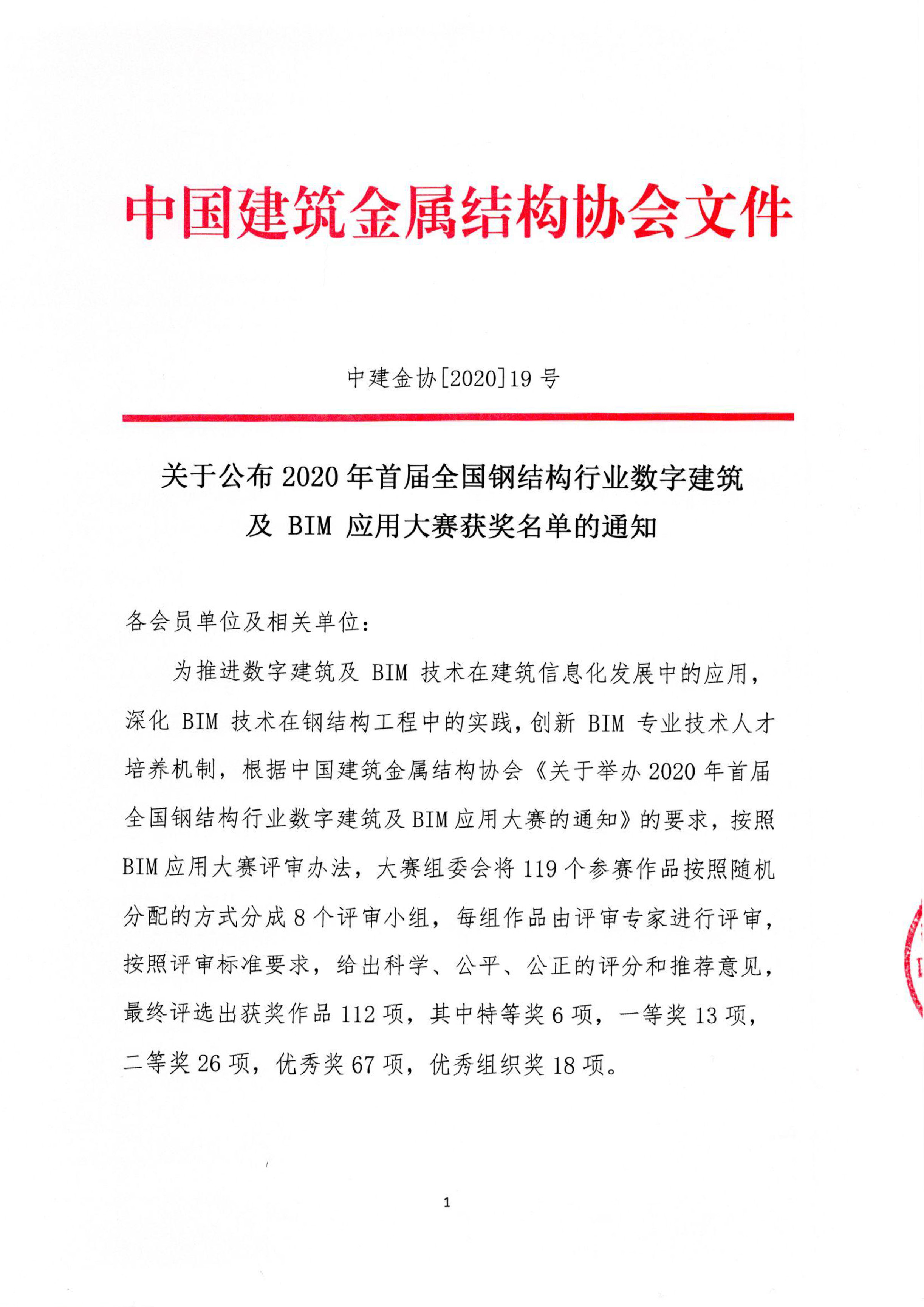 关于公布2020年首届全国钢结构行业数字建筑及 BIM 应用大赛获奖名单的通知