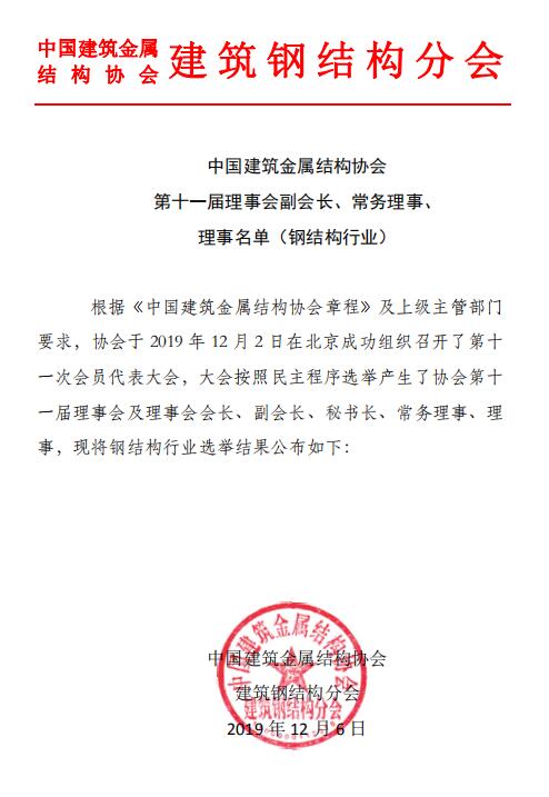 中国建筑金属结构协会第十一届理事会副会长、常务理事、理事名单(钢结构行业)