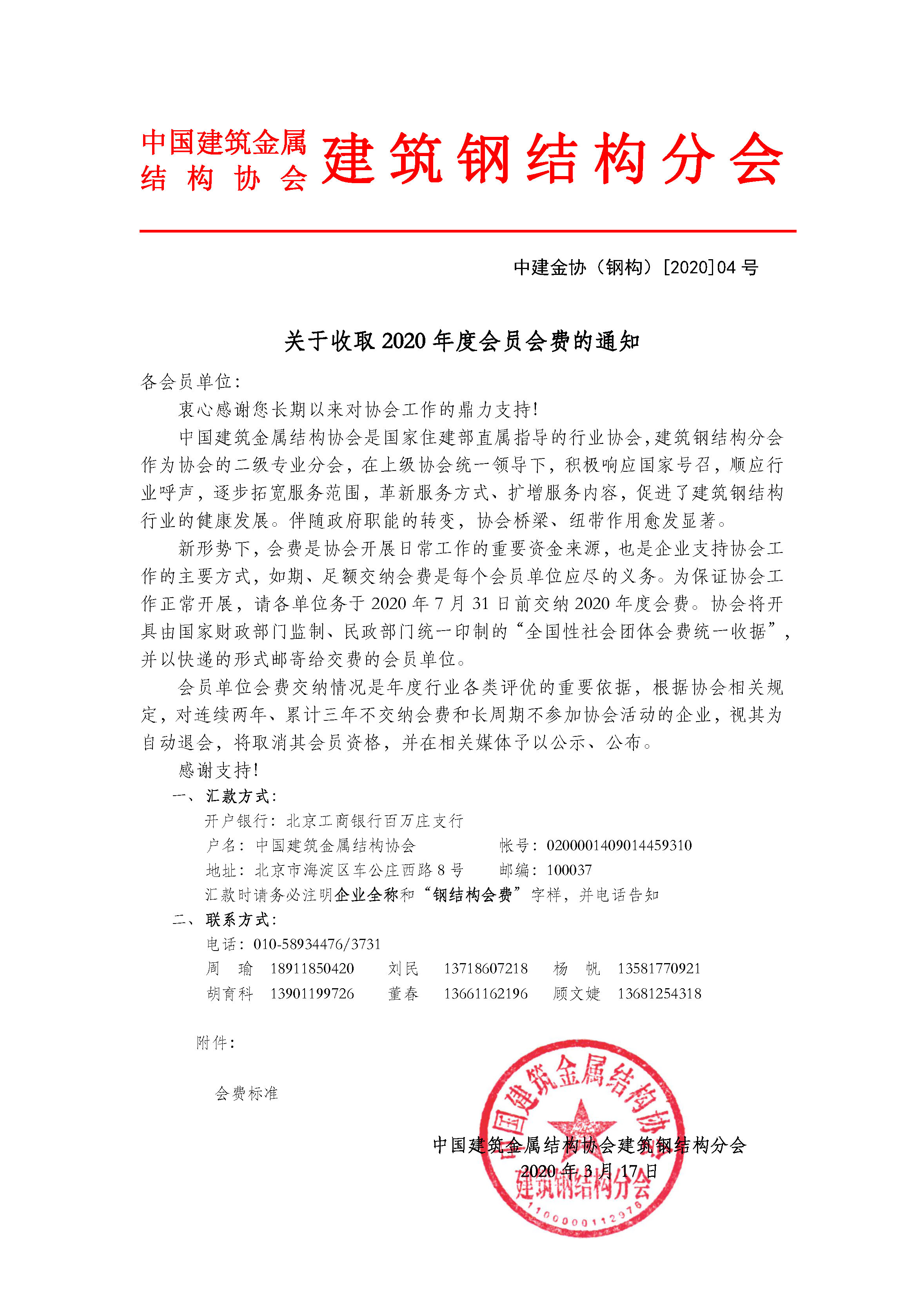 关于收取2020年度建筑钢结构分会会员会费的通知
