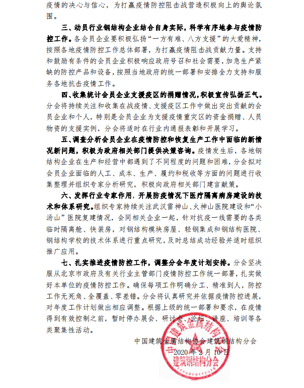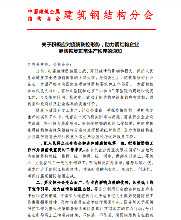 关于积极应对疫情防控形势,助力钢结构企业尽快恢复正常生产秩序的通知