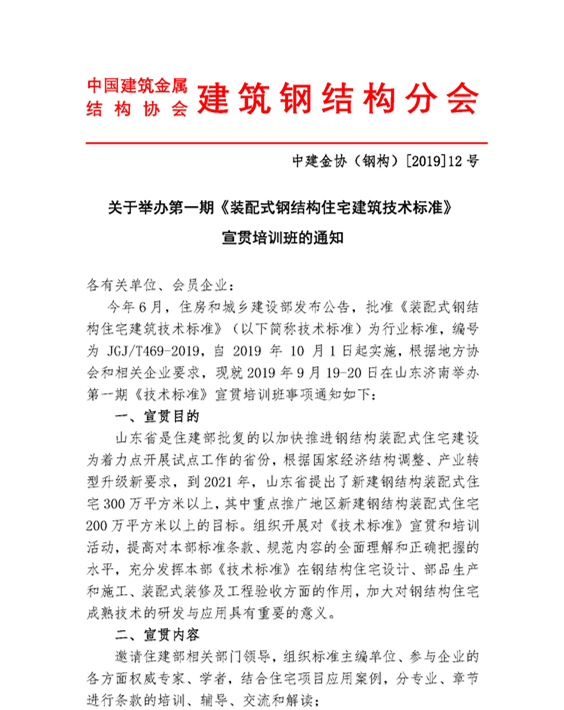 关于举办第一期《装配式钢结构住宅建筑技术标准》宣贯培训班的通知