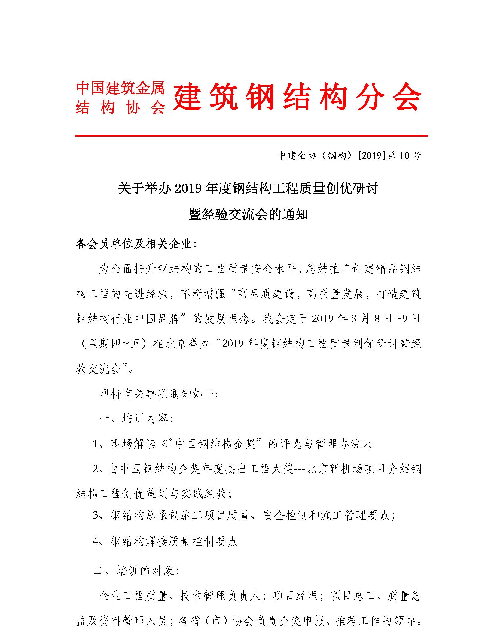 关于举办2019年度钢结构工程质量创优研讨暨经验交流会的通知