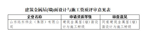 根据《建筑金属屋(墙)面设计与施工资质管理办法》的规定,我协会对山东远东伟业(集团)有限公司申报建筑金属屋(墙)面设计与施工资质的企业资料进行了审查核实,现将审查意见予以公示,公示时间为7个工作日。请相关部门和企业查阅。
