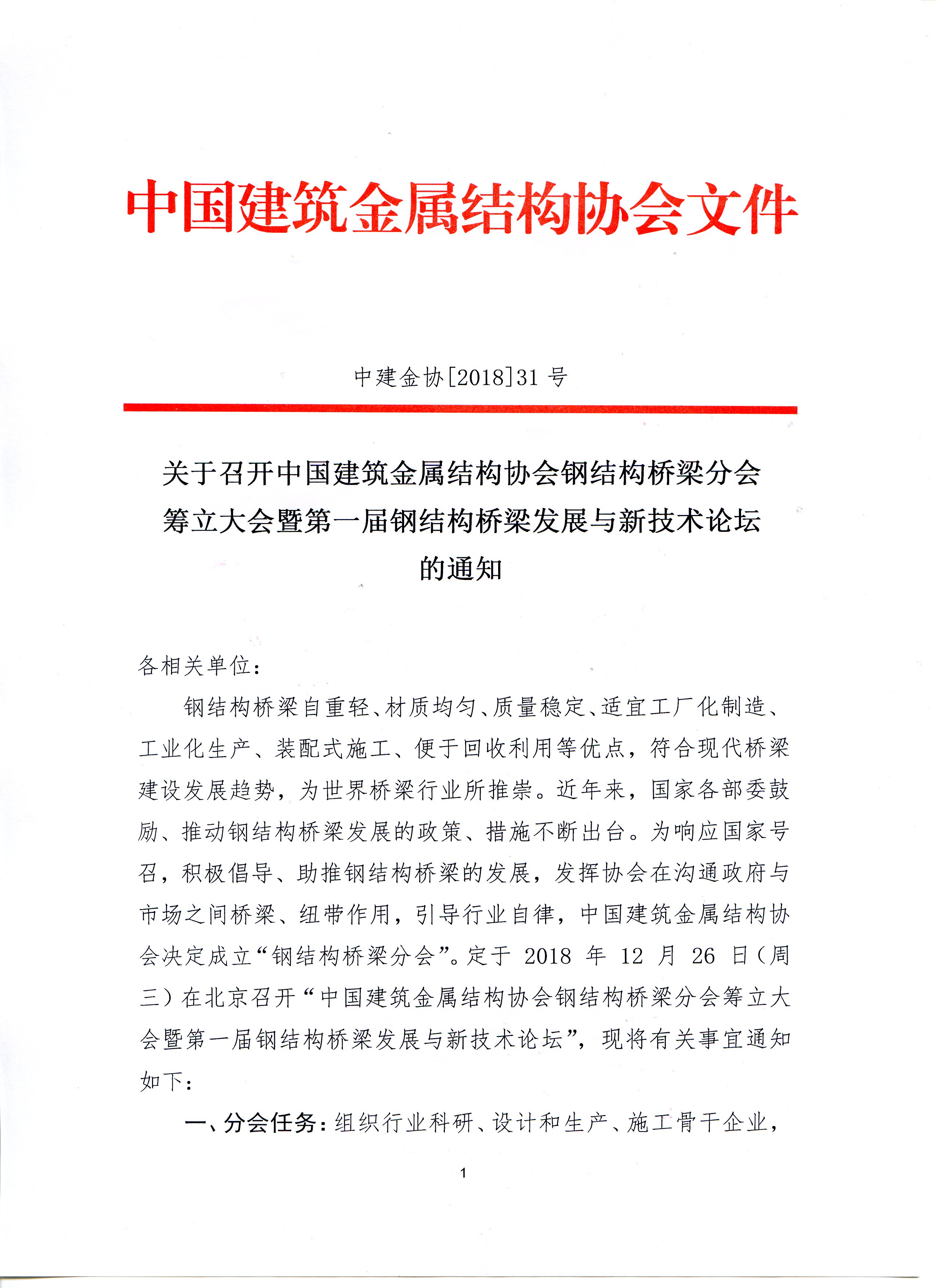关于召开中国建筑金属结构协会钢结构桥梁分会筹立大会暨第一届钢结构桥梁发展与新技术论坛的通知