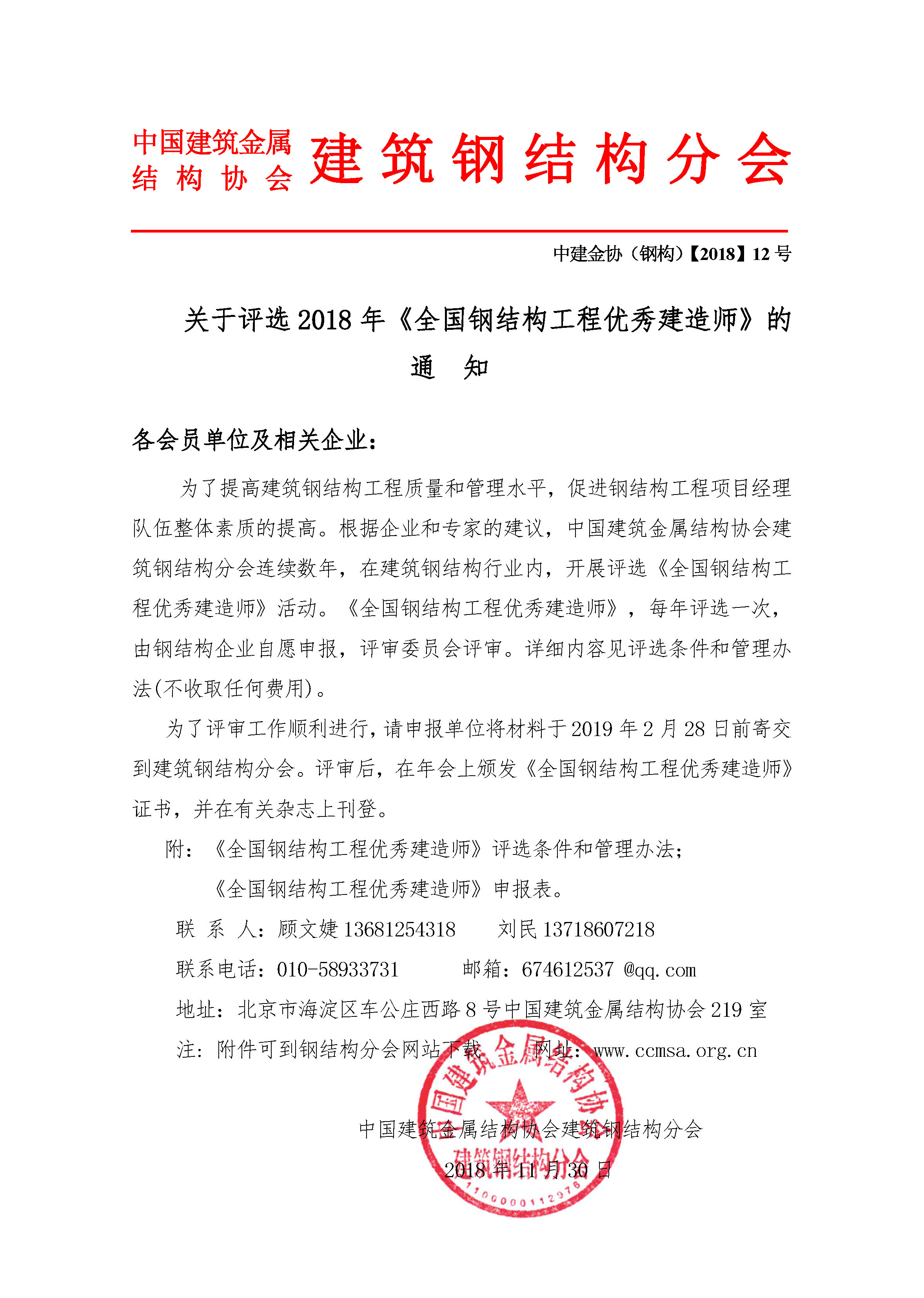 关于评选2018年《全国钢结构工程优秀建造师》的通知