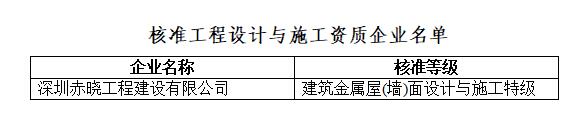 根据《建筑金属屋(墙)面设计与施工资质等级标准》和《建筑金属屋(墙)面设计与施工资质管理办法》的规定,经审核,深圳赤晓工程建设有限公司申请的资质等级符合相应等级要求,准予发证。