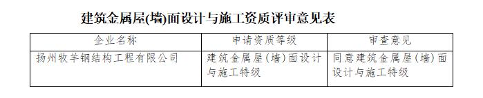 根据《建筑金属屋(墙)面设计与施工资质管理办法》的规定,我协会对扬州牧羊钢结构工程有限公司申报建筑金属屋(墙)面设计与施工资质的企业资料进行了审查核实,现将审查意见予以公示,公示时间为7个工作日。请相关部门和企业查阅。