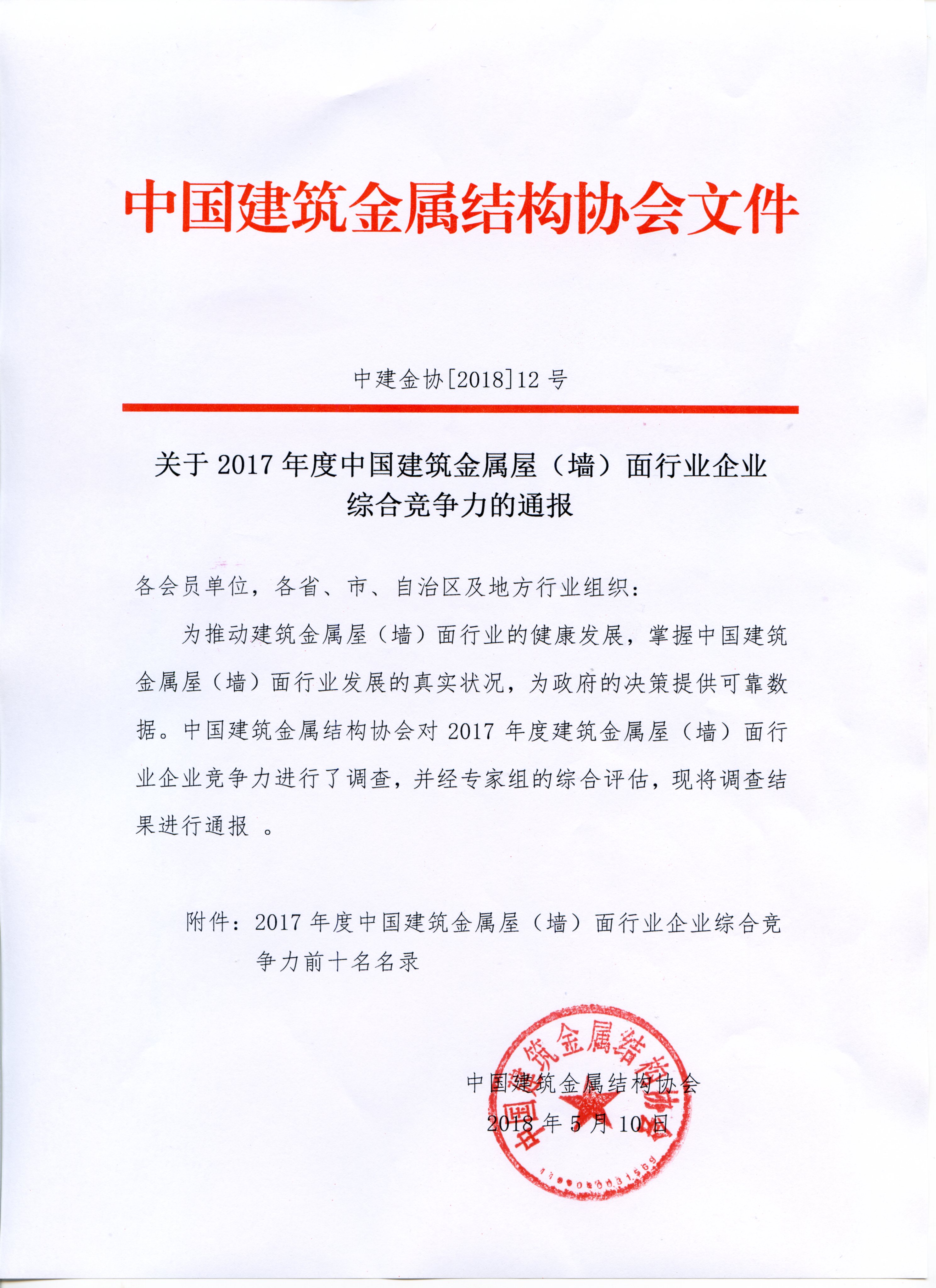 关于2017年度中国建筑金属屋墙面行业企业综合竞争力通报