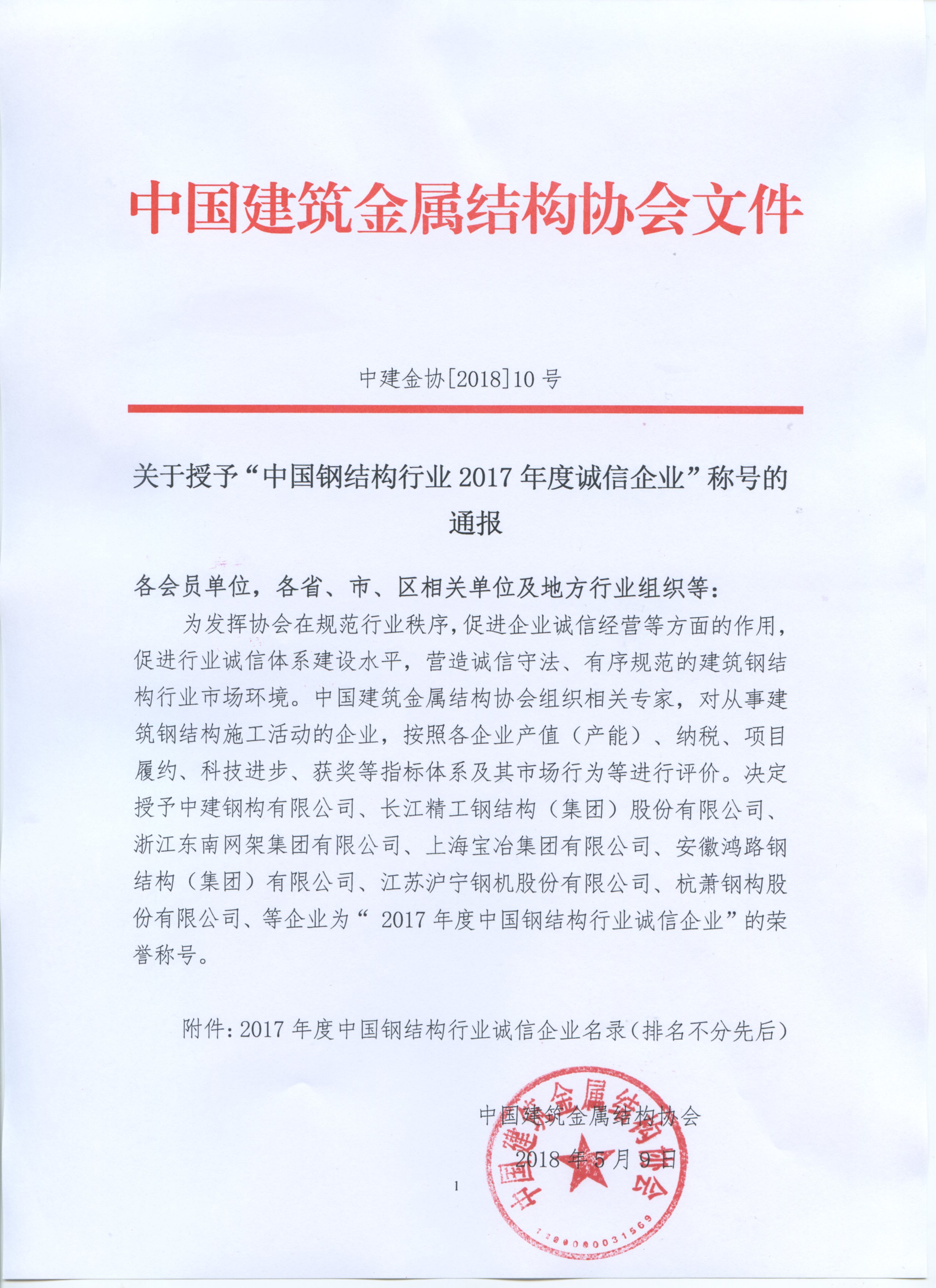 关于授予“中国钢结构行业2017年度诚信企业”称号的通报