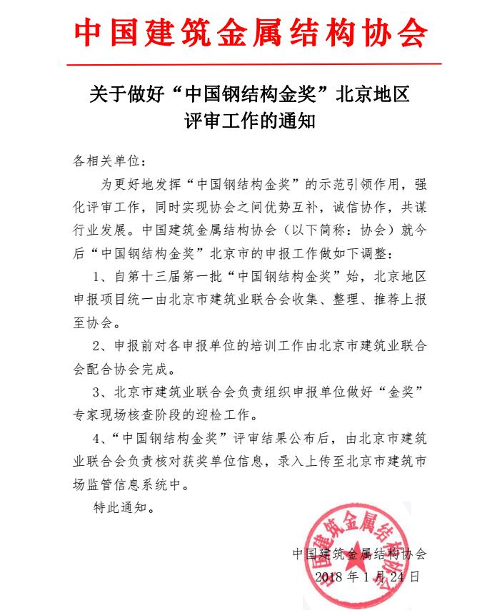 关于做好“中国钢结构金奖”北京地区评审工作的通知