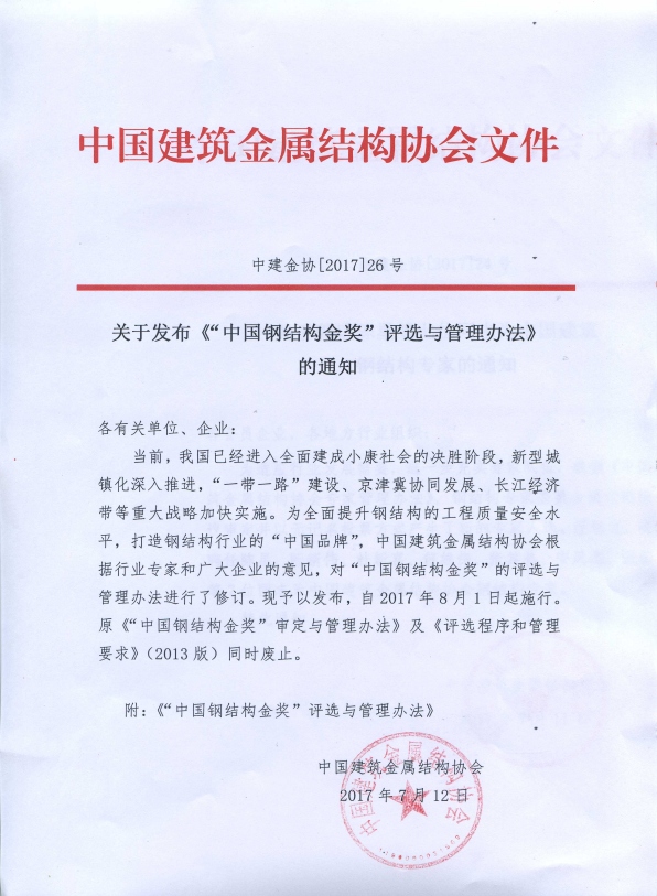 关于发布《“中国钢结构金奖”评选与管理办法》的通知