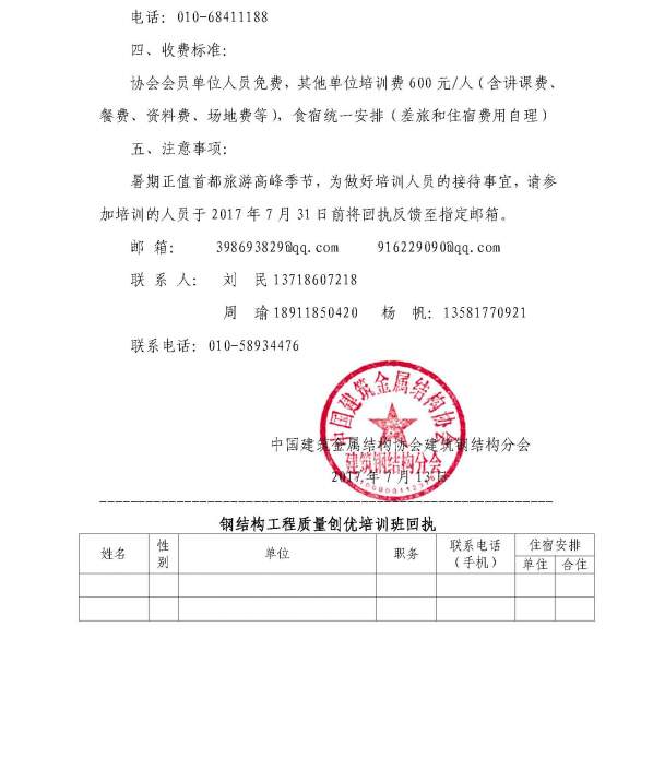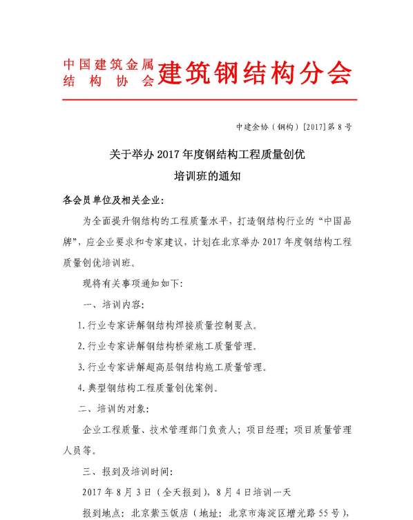 关于举办 2017 年度钢结构工程质量创优培训班的通知