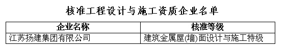 根据《建筑金属屋(墙)面设计与施工资质等级标准》和《建筑金属屋(墙)面设计与施工资质管理办法》的规定,经审核,江苏扬建集团有限公司申请的资质等级符合相应等级要求,准予发证。