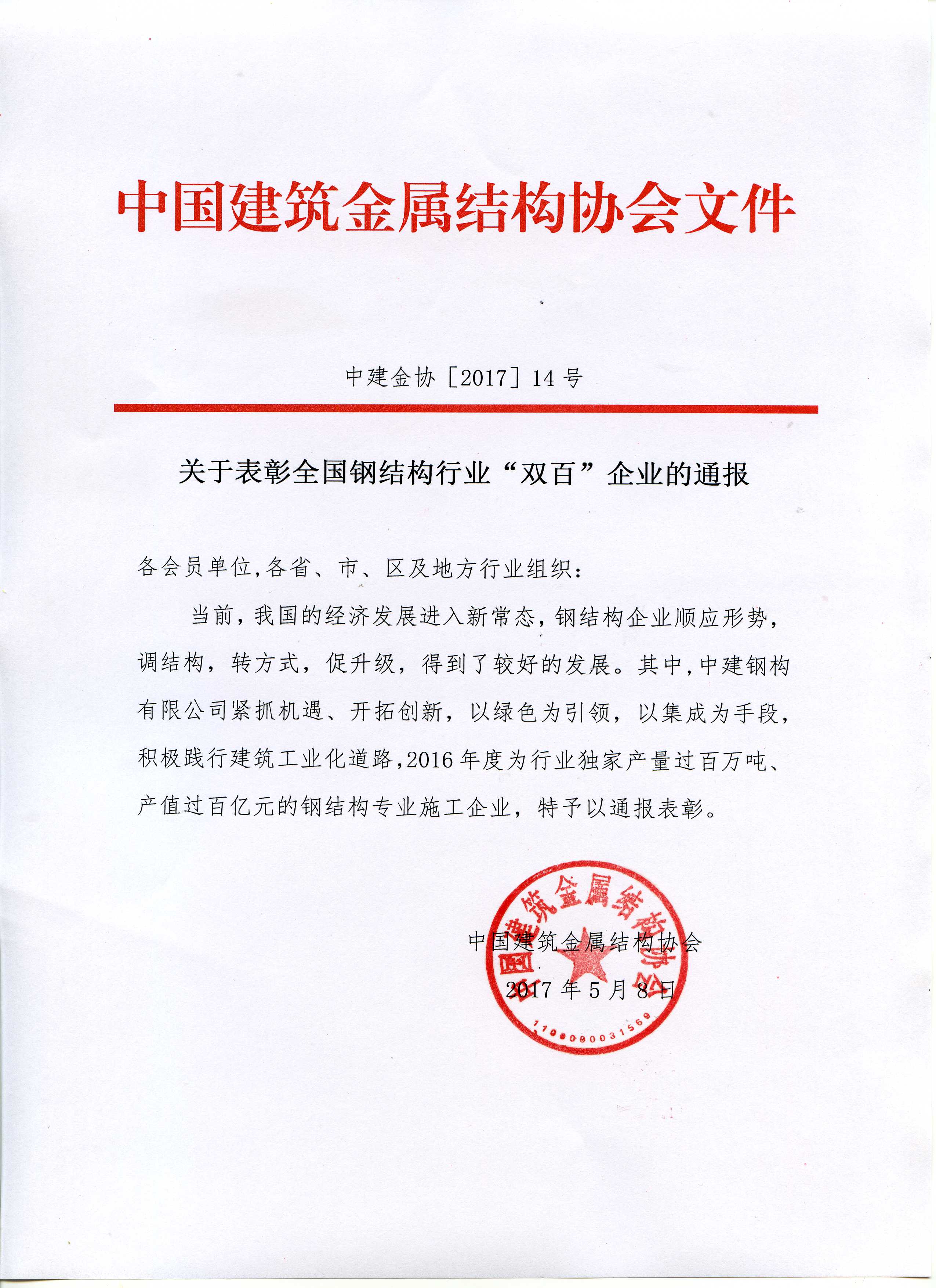 关于表彰全国钢结构行业“双百”企业通报