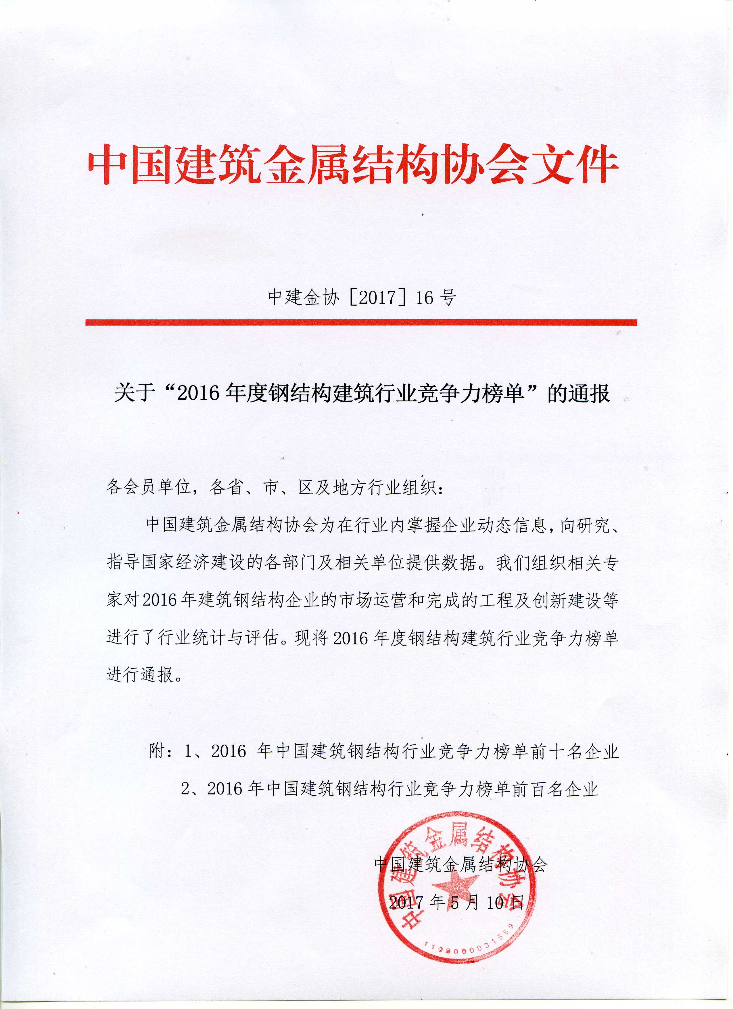 关于“2016年度钢结构建筑行业竞争力榜单”的通报