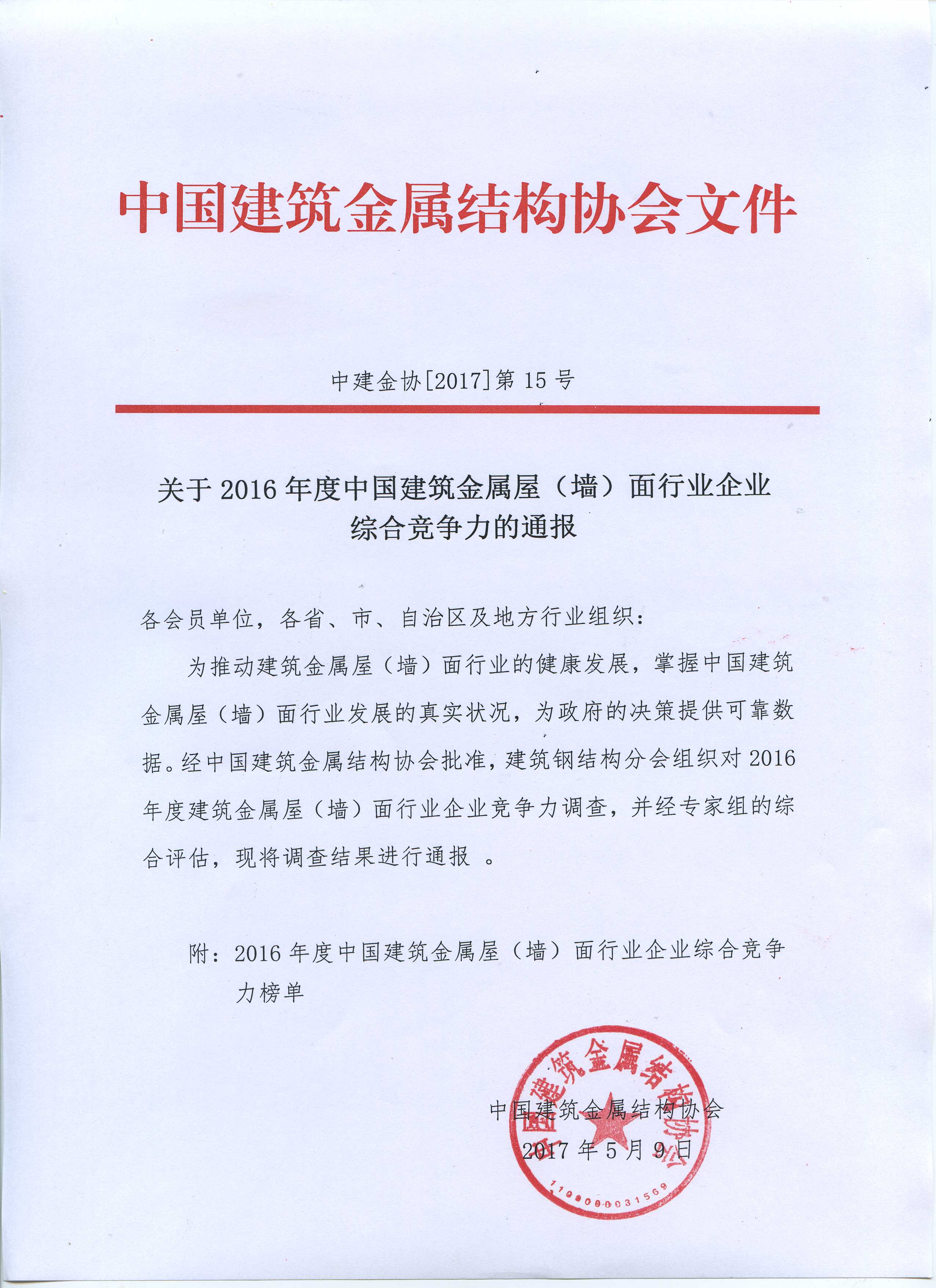 关于2016年度中国建筑金属屋(墙)面行业企业综合竞争力榜单通报
