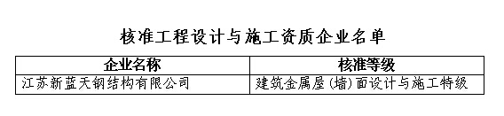 根据《建筑金属屋(墙)面设计与施工资质等级标准》和《建筑金属屋(墙)面设计与施工资质管理办法》的规定,经审核,江苏新蓝天钢结构有限公司申请的资质等级符合相应等级要求,准予发证。