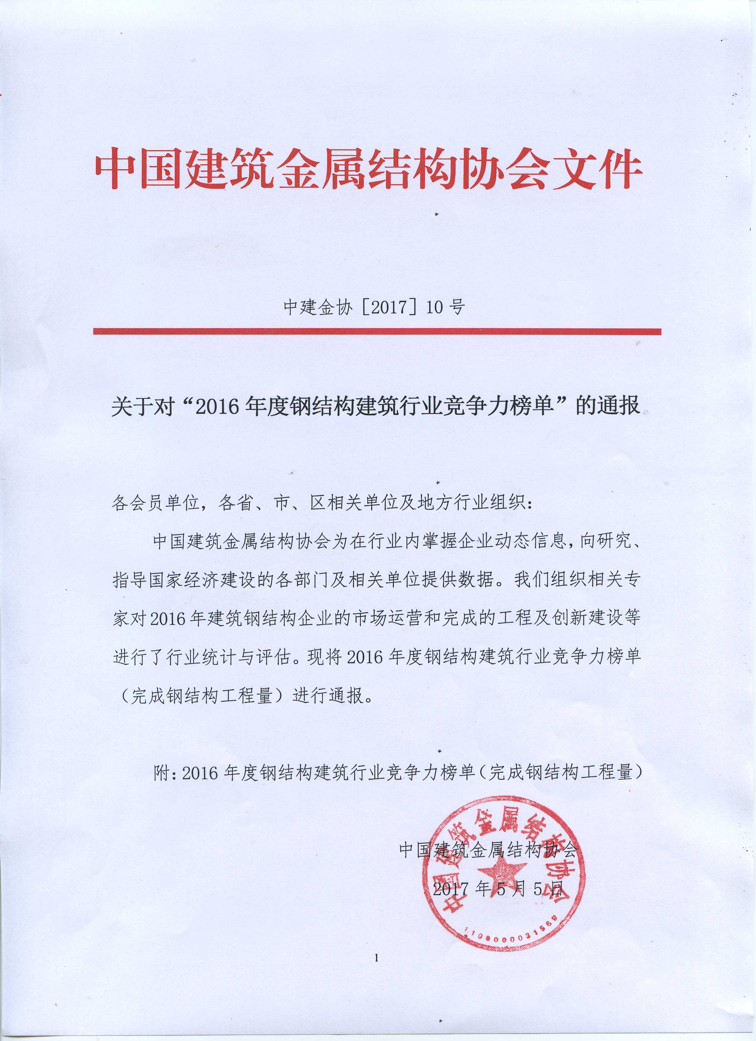关于对“2016年度钢结构建筑行业竞争力榜单”的通告