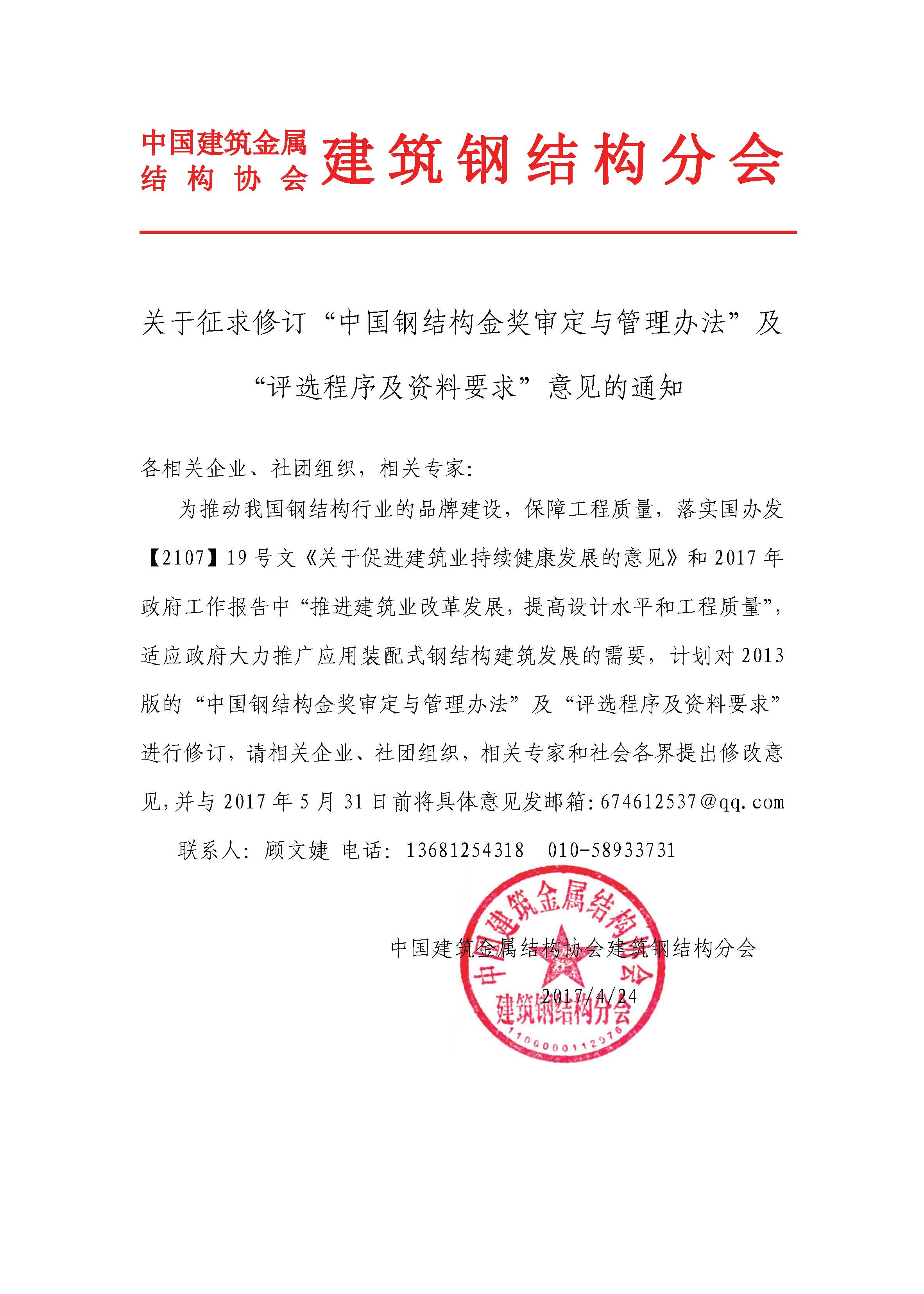 关于征求修订“中国钢结构金奖审定与管理办法”及“评选程序及资料要求”意见的通知