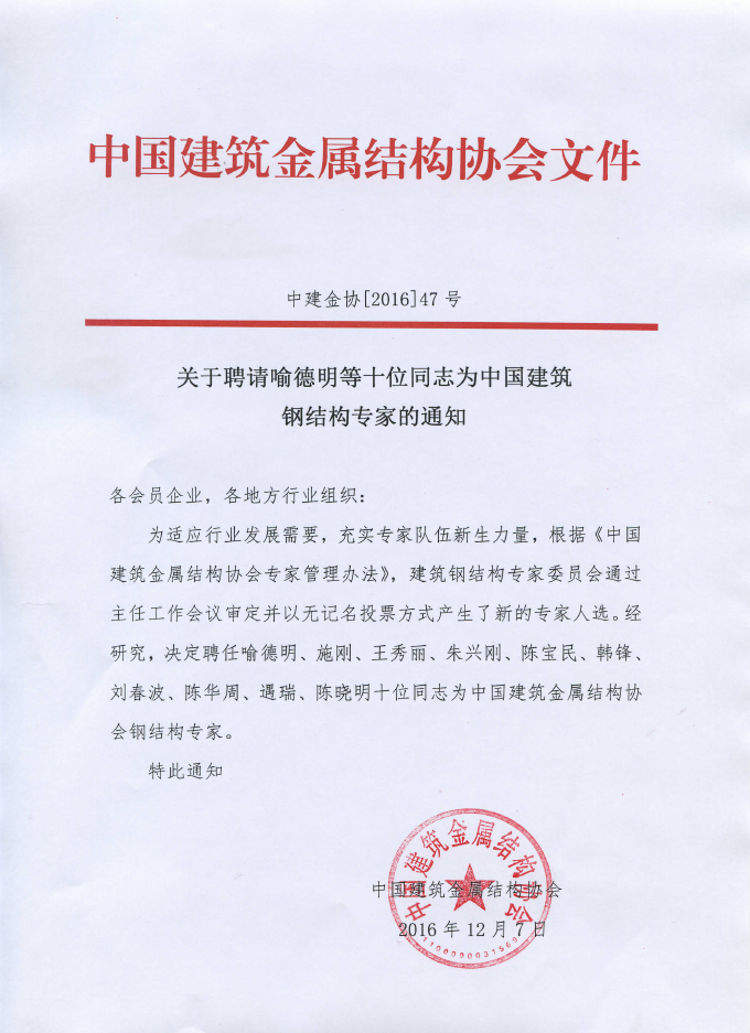 关于聘请喻德明等十位同志为中国建筑钢结构专家的通知