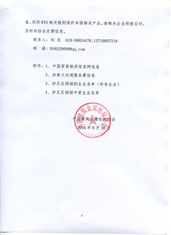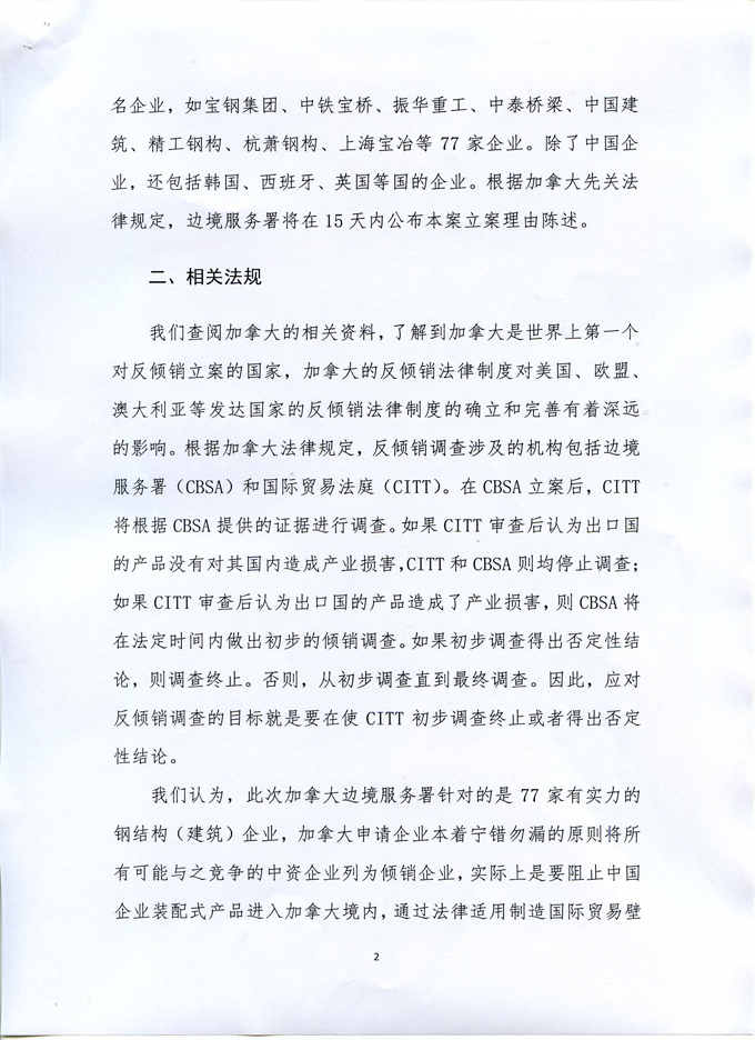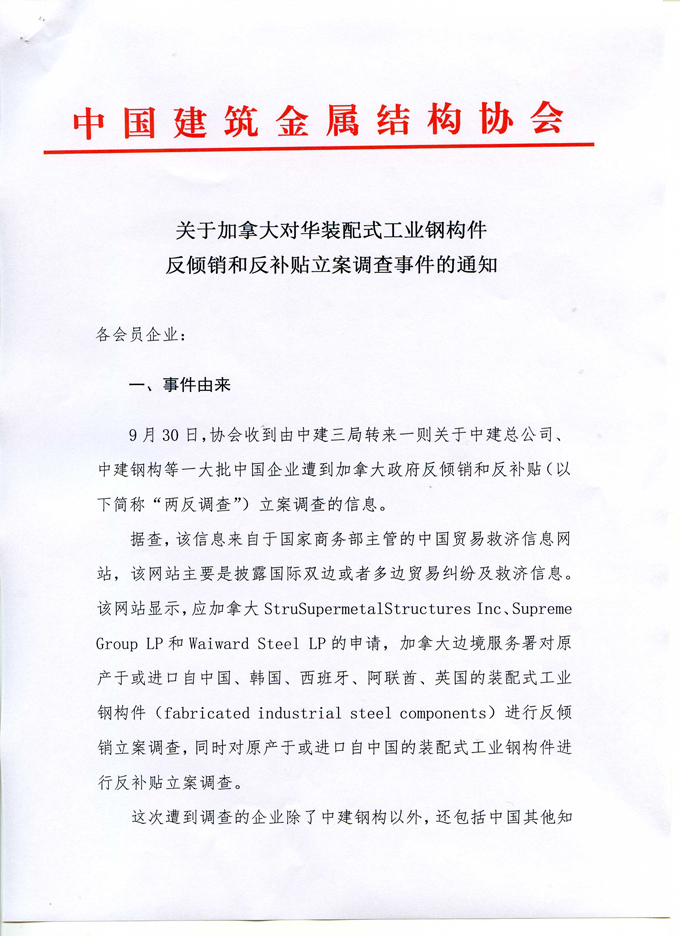 关于加拿大对华装配式工业钢构件反倾销和反补贴立案调查事件的通知