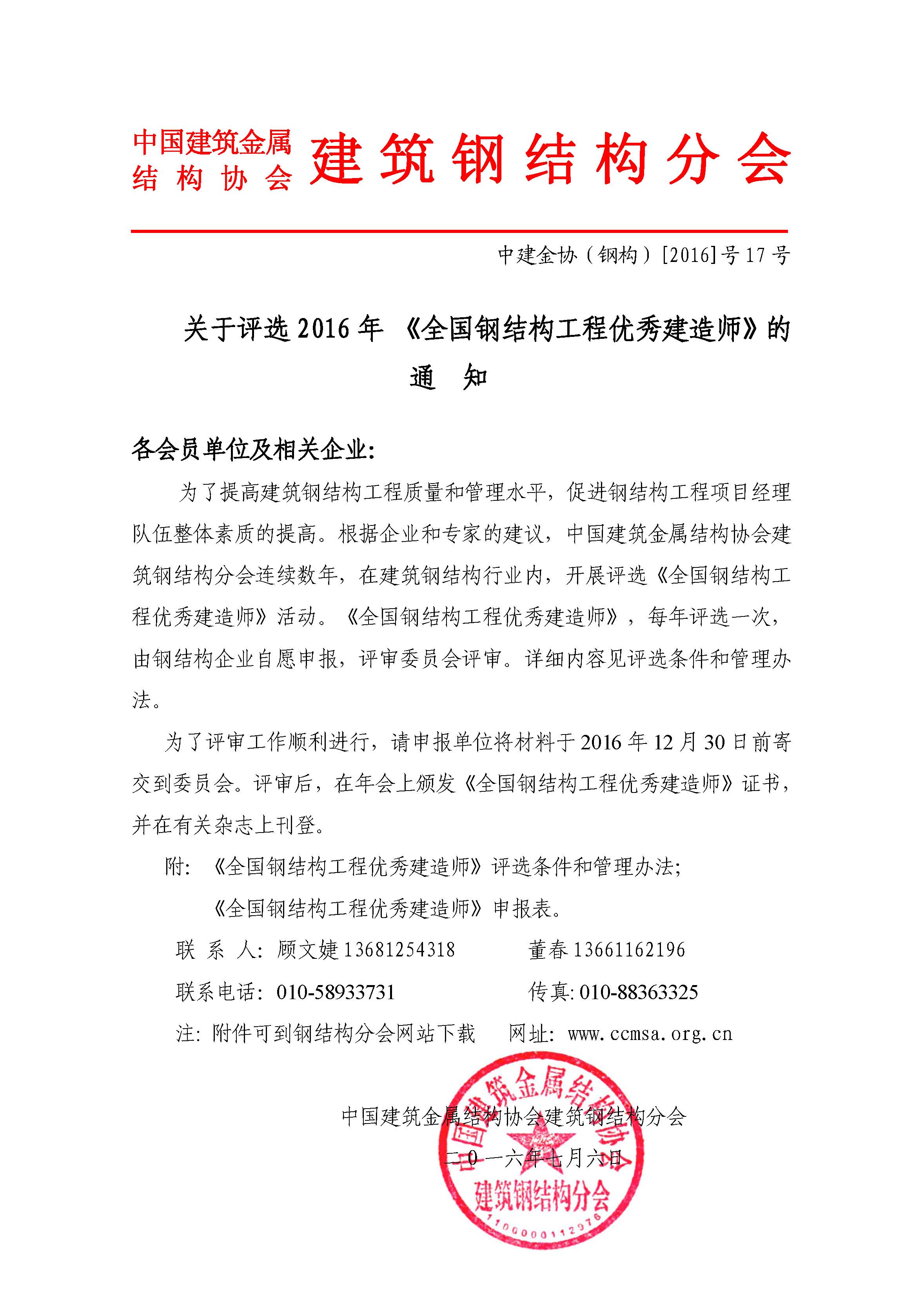 关于评选2016年 《全国钢结构工程优秀建造师》的通知
