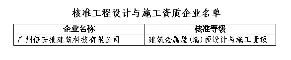 根据《建筑金属屋(墙)面设计与施工资质等级标准》和《建筑金属屋(墙)面设计与施工资质管理办法》的规定,经审核,广州倍安捷建筑科技有限公司申请的资质等级符合相应等级要求,准予发证。