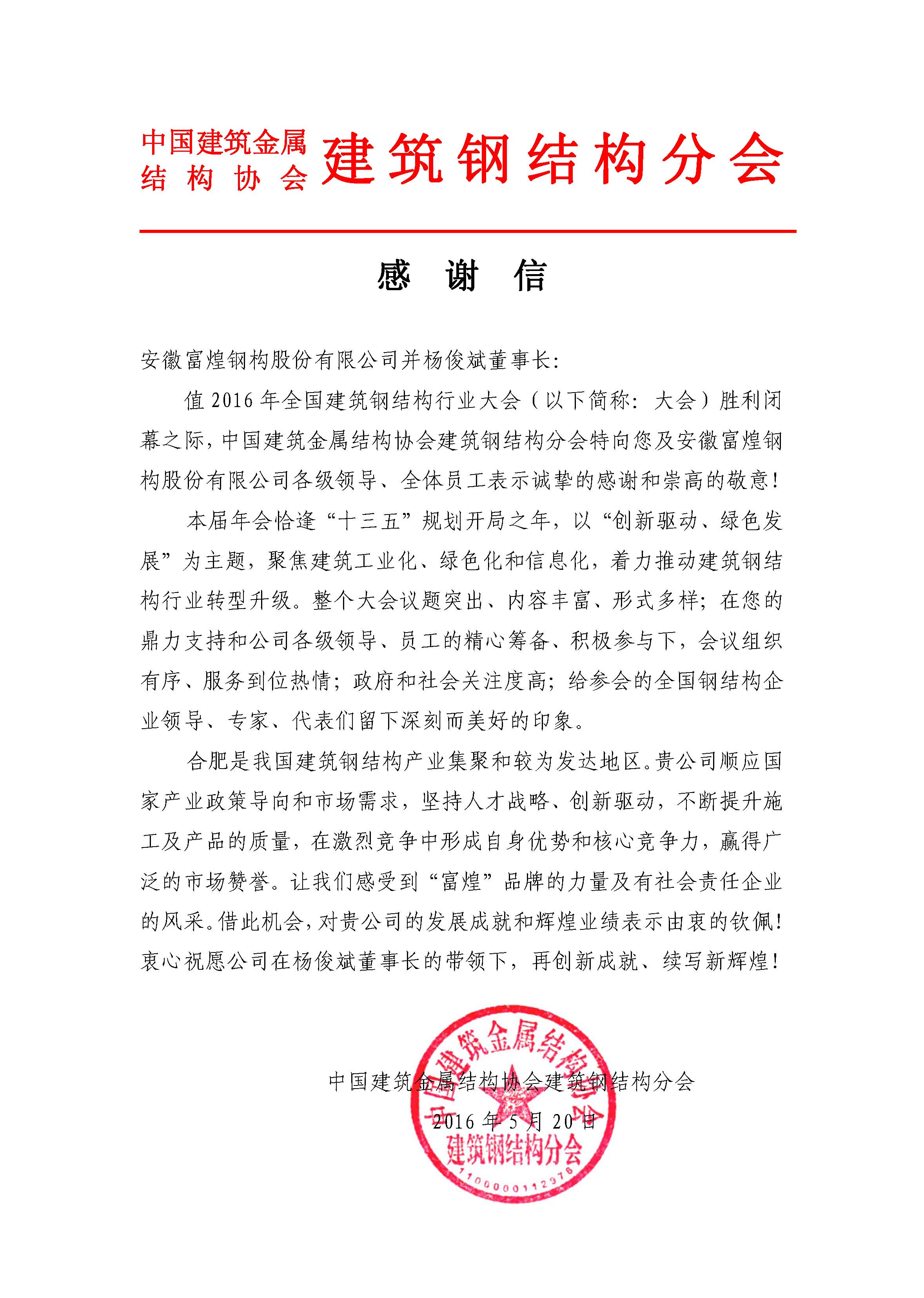 感谢信-致安徽富煌钢构股份有限公司并杨俊斌董事长