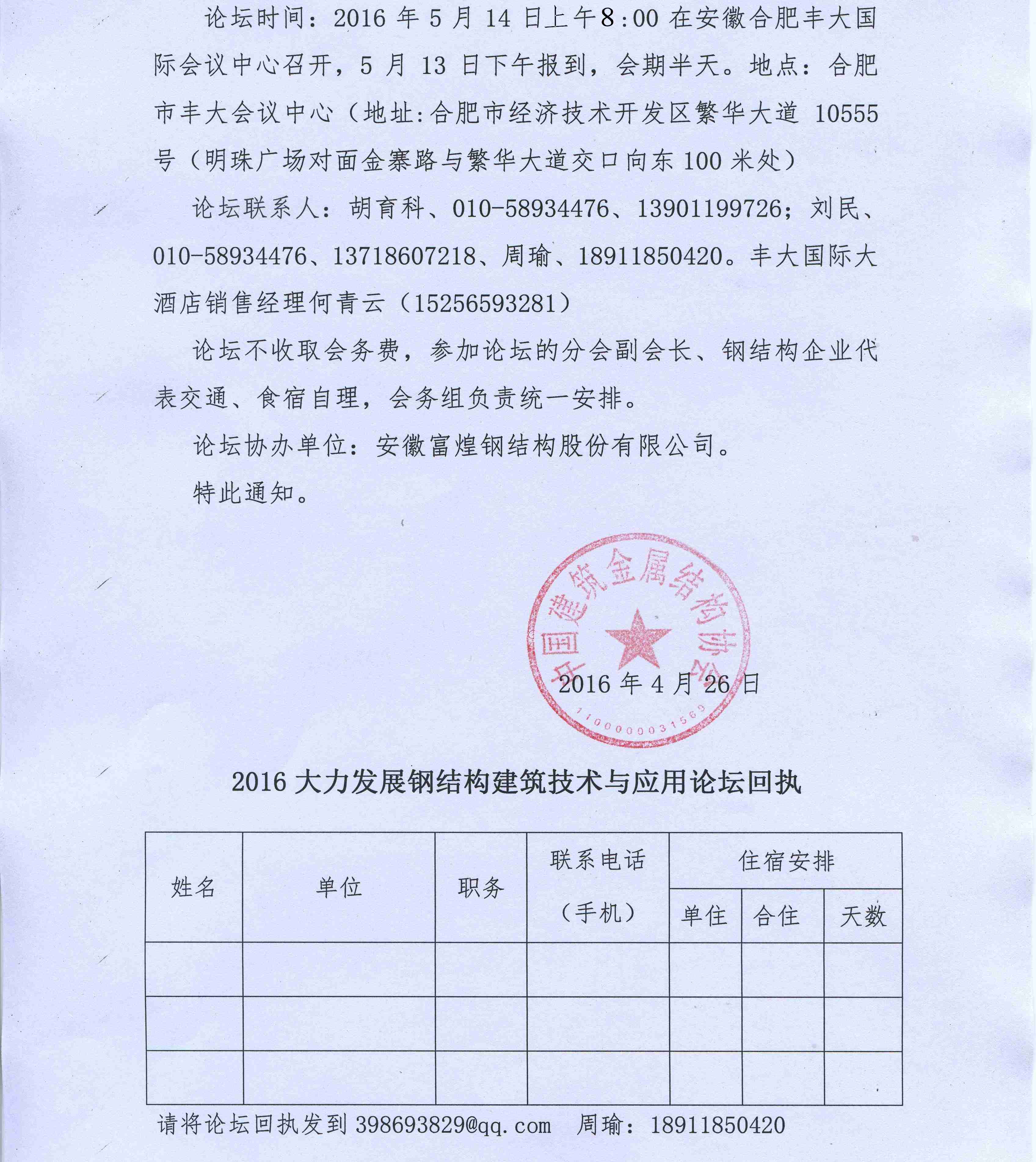 关于举办“2016’大力发展钢结构建筑技术与应用论坛”的通知回执