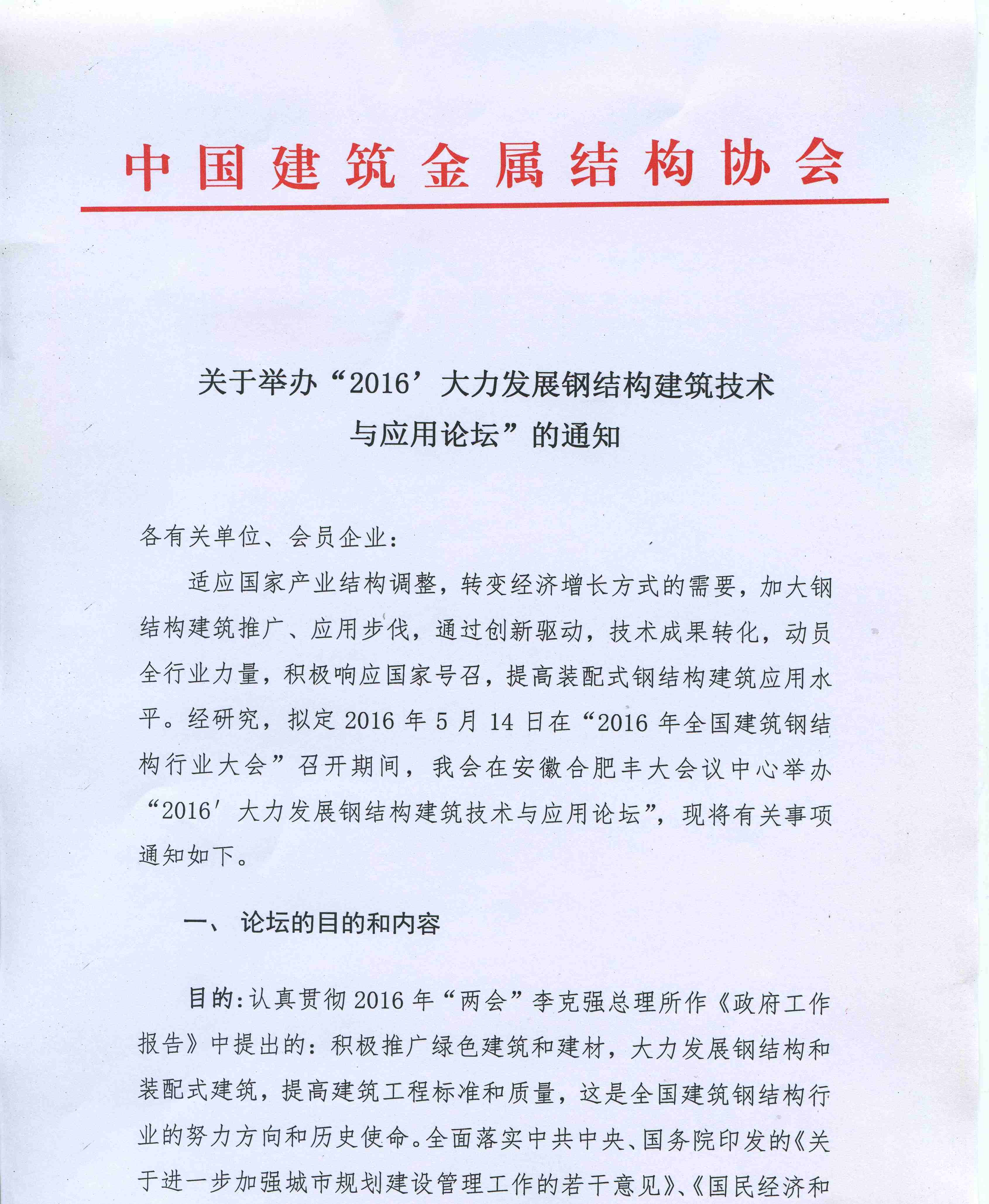 关于举办“2016’大力发展钢结构建筑技术与应用论坛”的通知