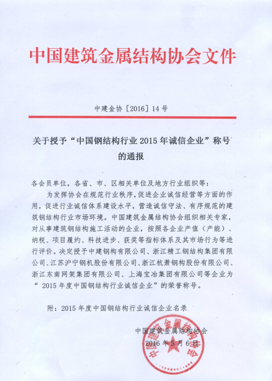 关于授予“中国钢结构行业2015年诚信(5A)企业”称号的通报