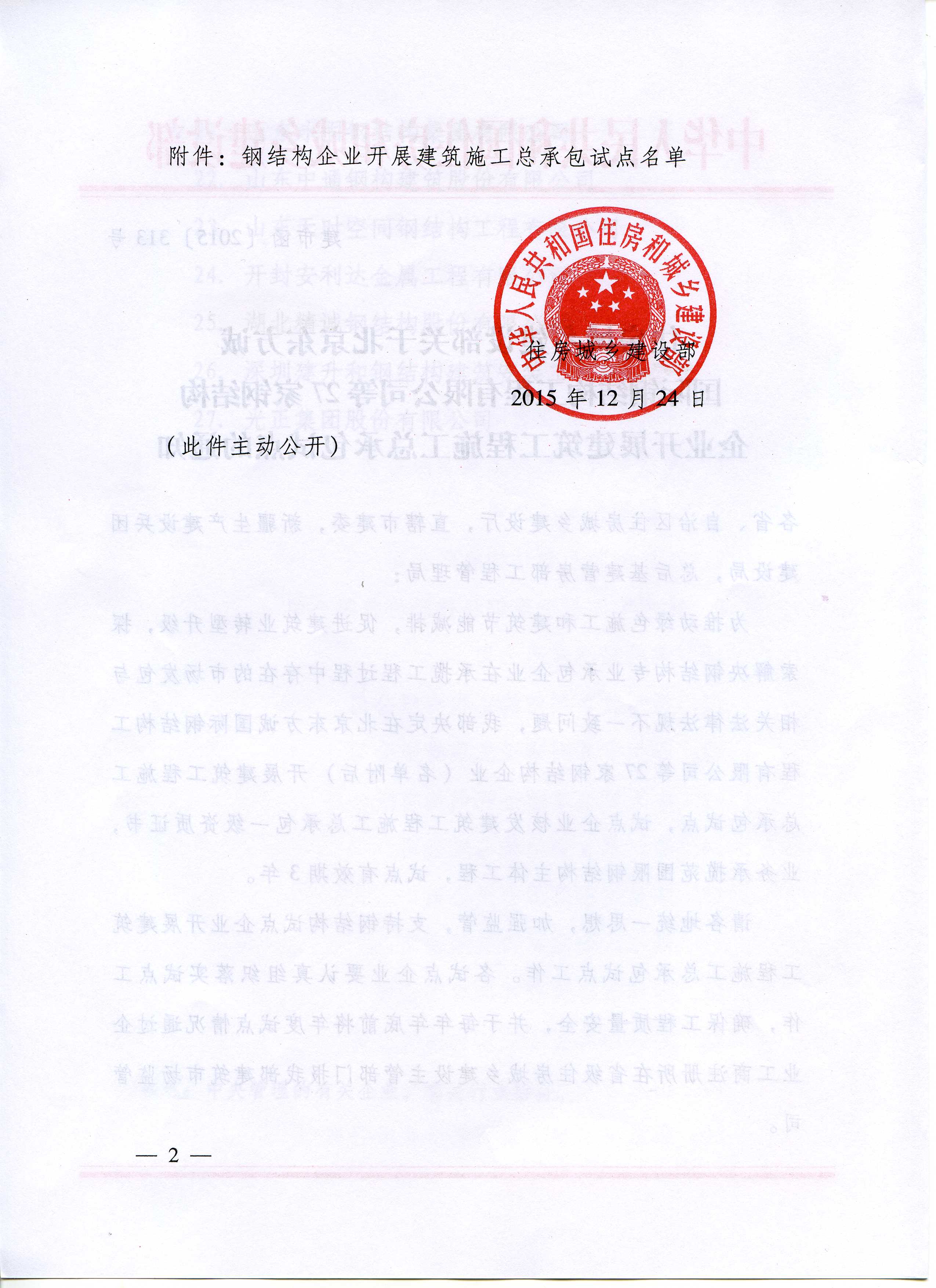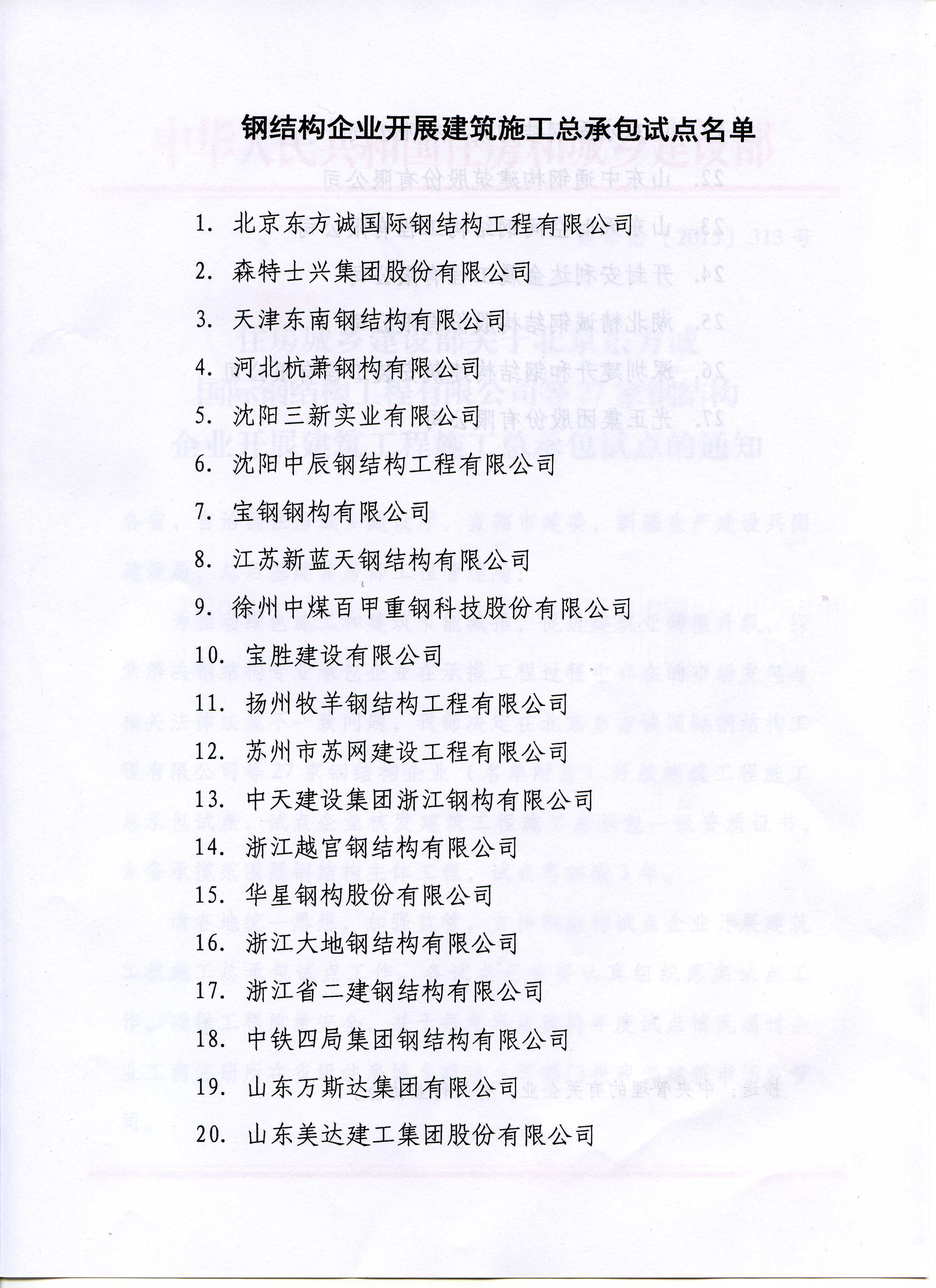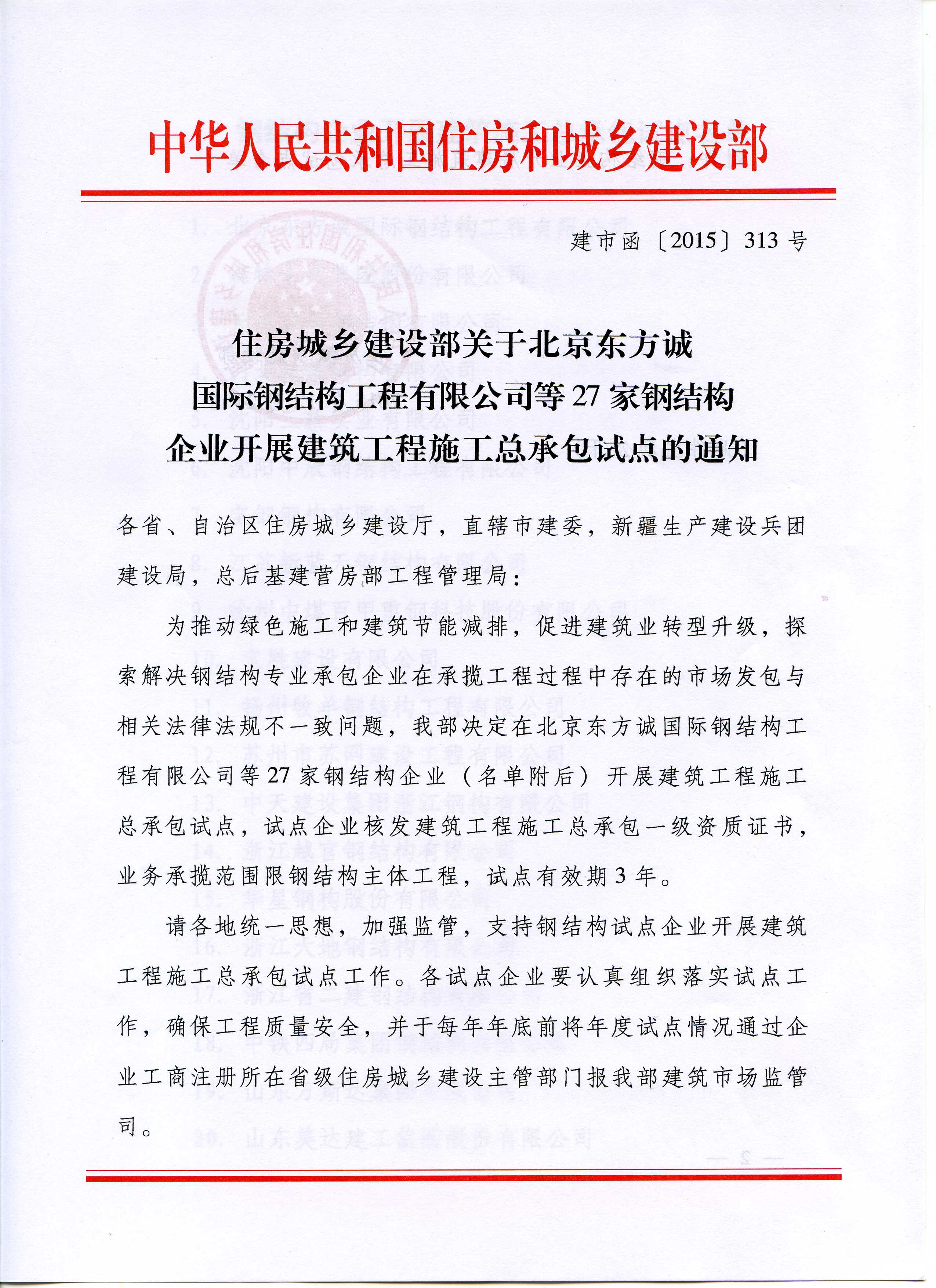 住房城乡建设部关于北京东方诚等27家钢结构企业开展建筑工程施工总承包试点的通知