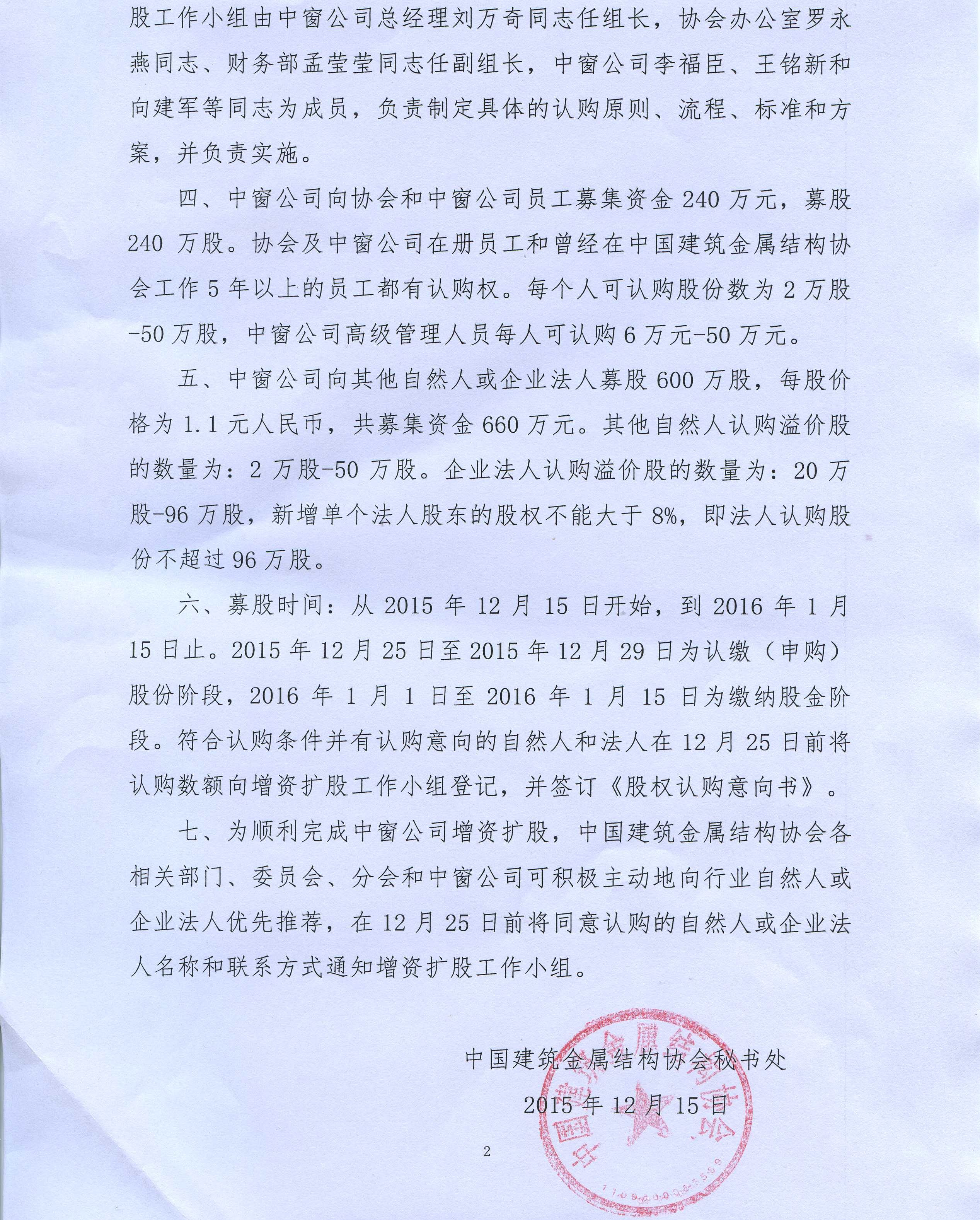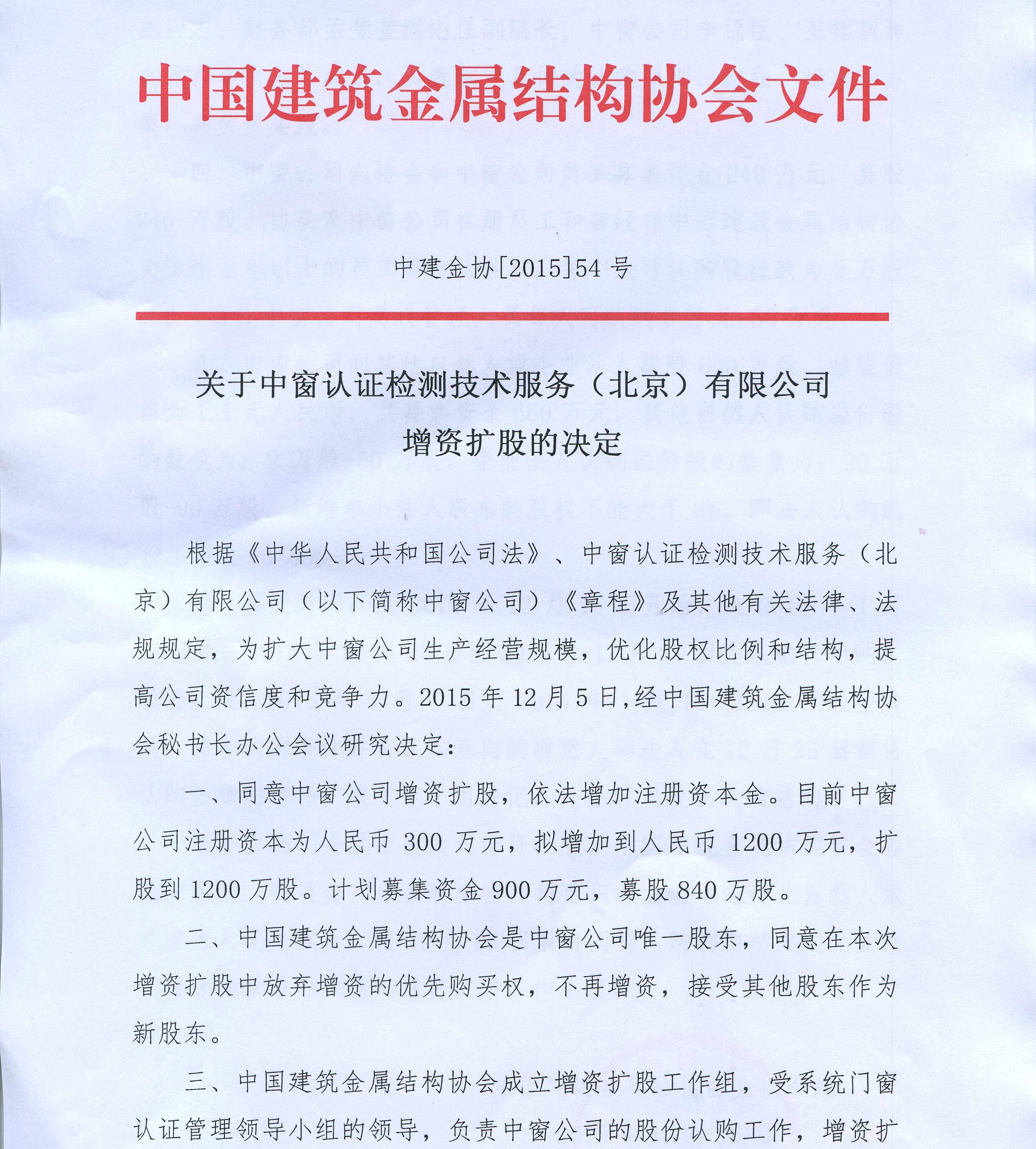 转发协会文件:关于中窗认证检测技术服务(北京)有限公司增资扩股的决定