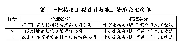 关于建筑金属屋(墙)面设计与施工资质第十一批核准工程设计与施工资质企业名单