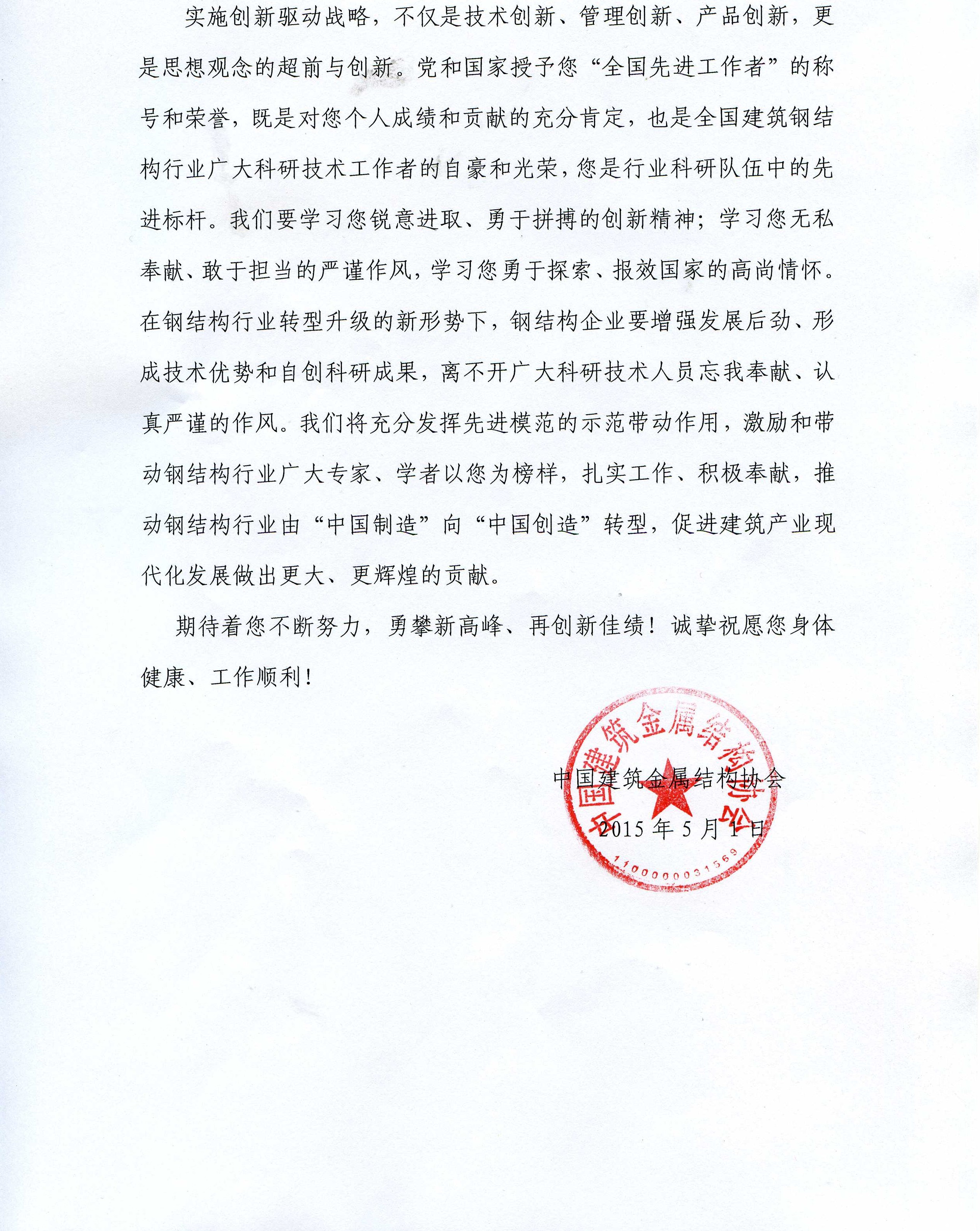 关于钢结构专家委员会专家聂建国被授予国家级“全国先进工作者”称号的贺信
