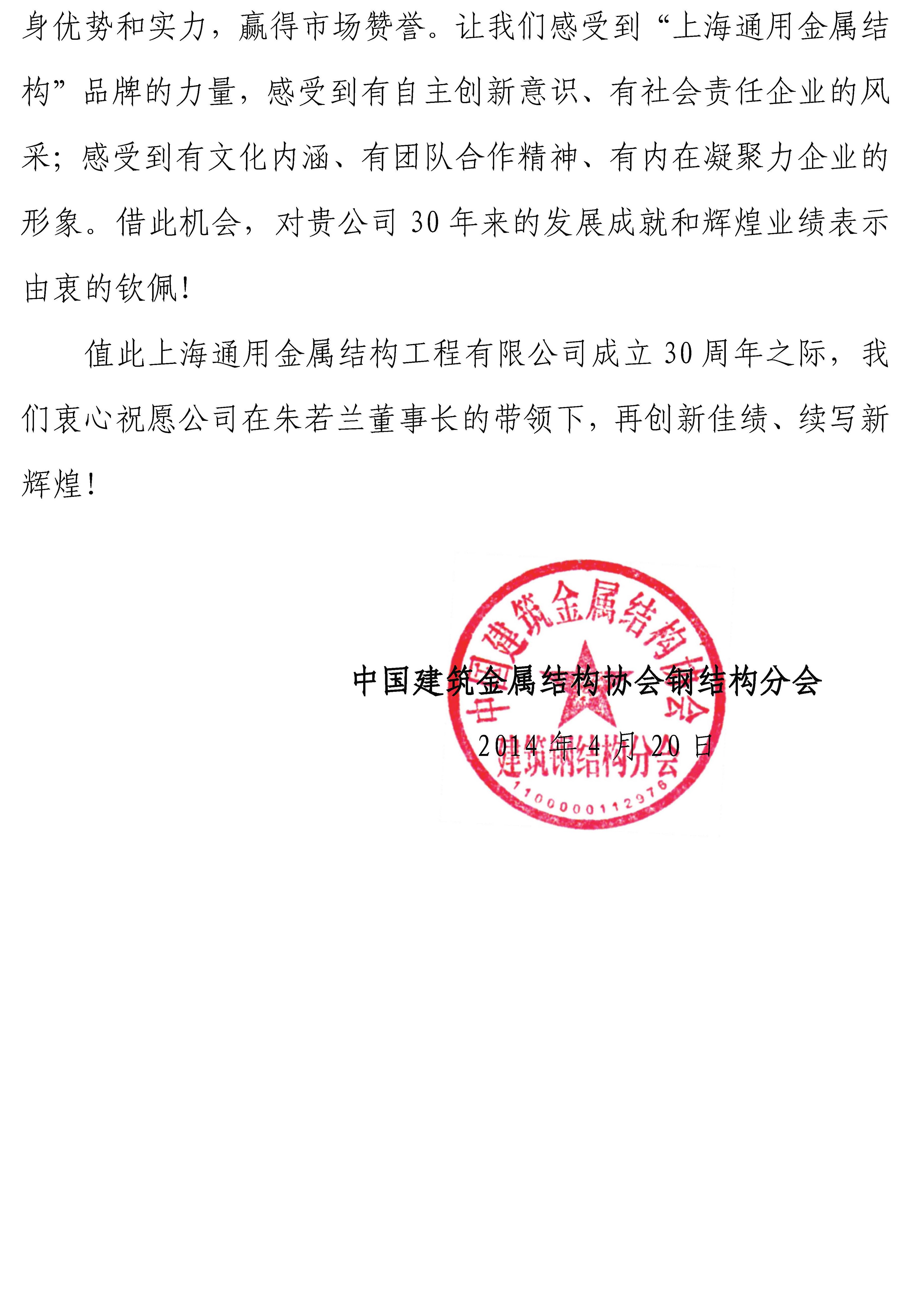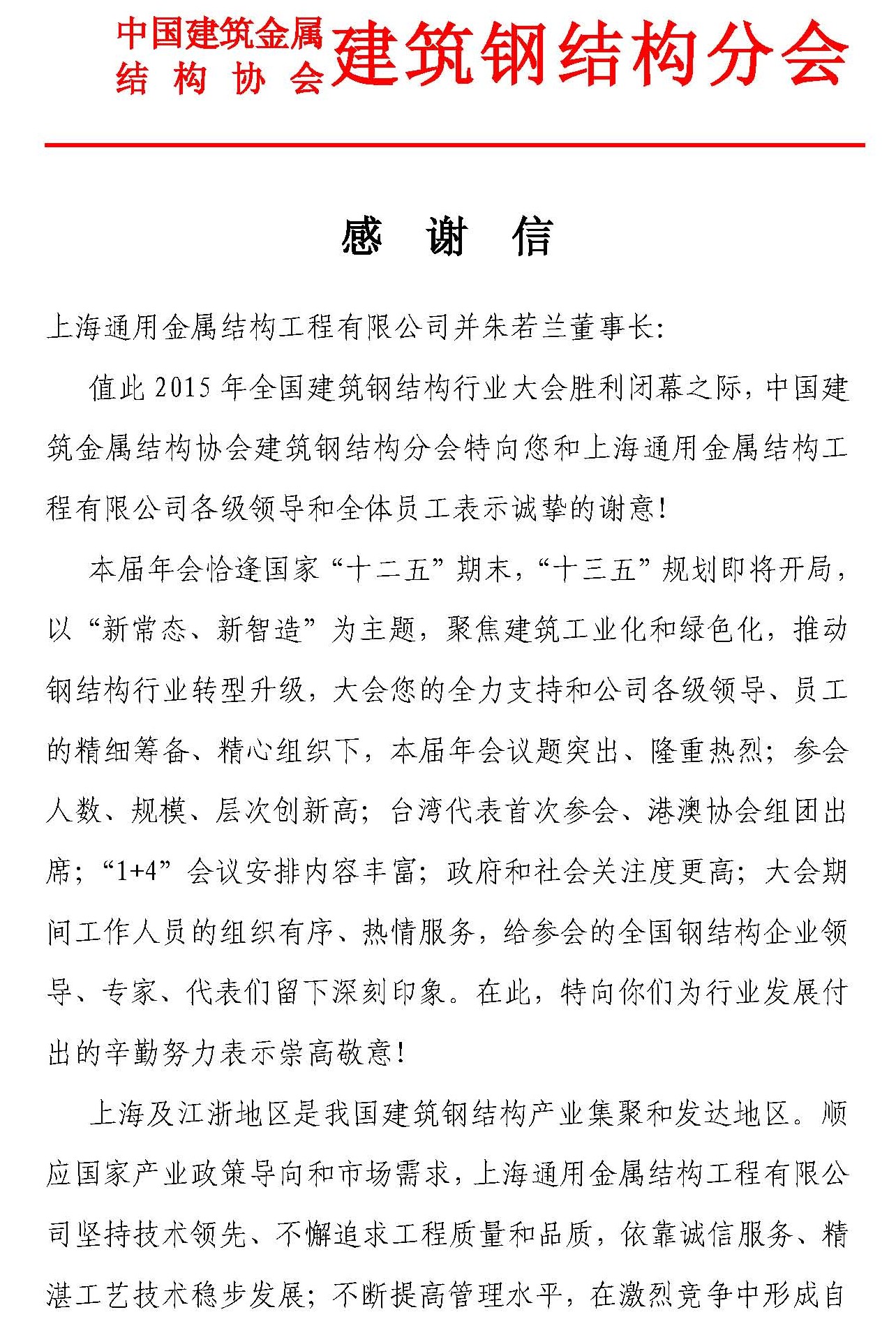 感 谢 信-年会承办单位上海通用金属结构工程有限公司