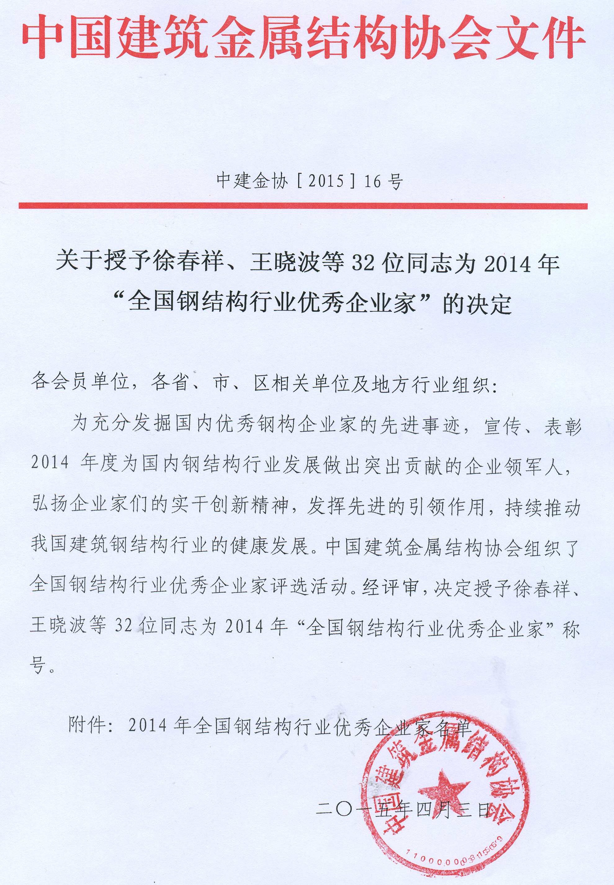 关于授予徐春祥 王晓波等32位同志为2014年“全国钢结构行业优秀企业家”的决定