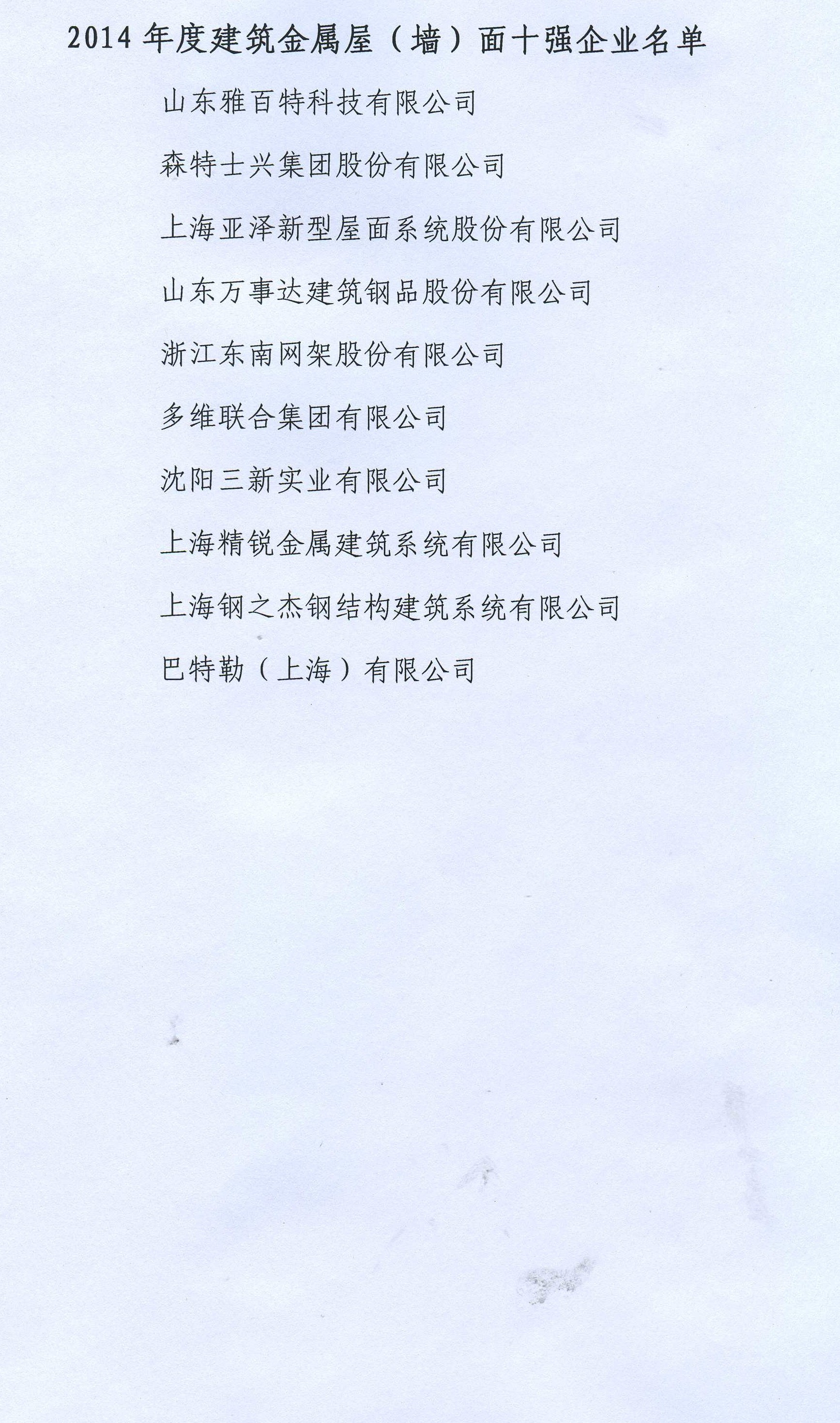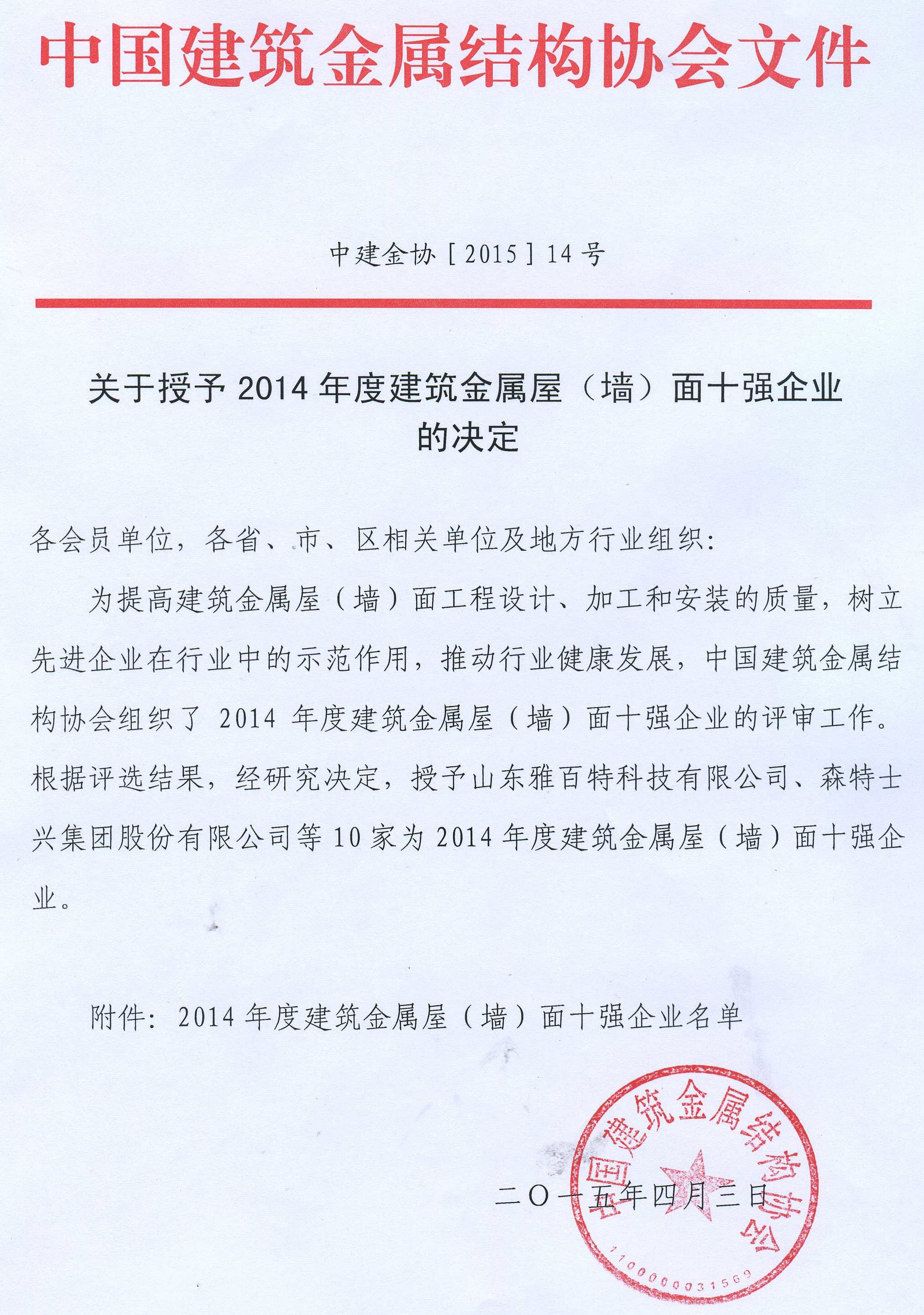 关于授予2014年度建筑金属屋(墙)面十强企业的决定