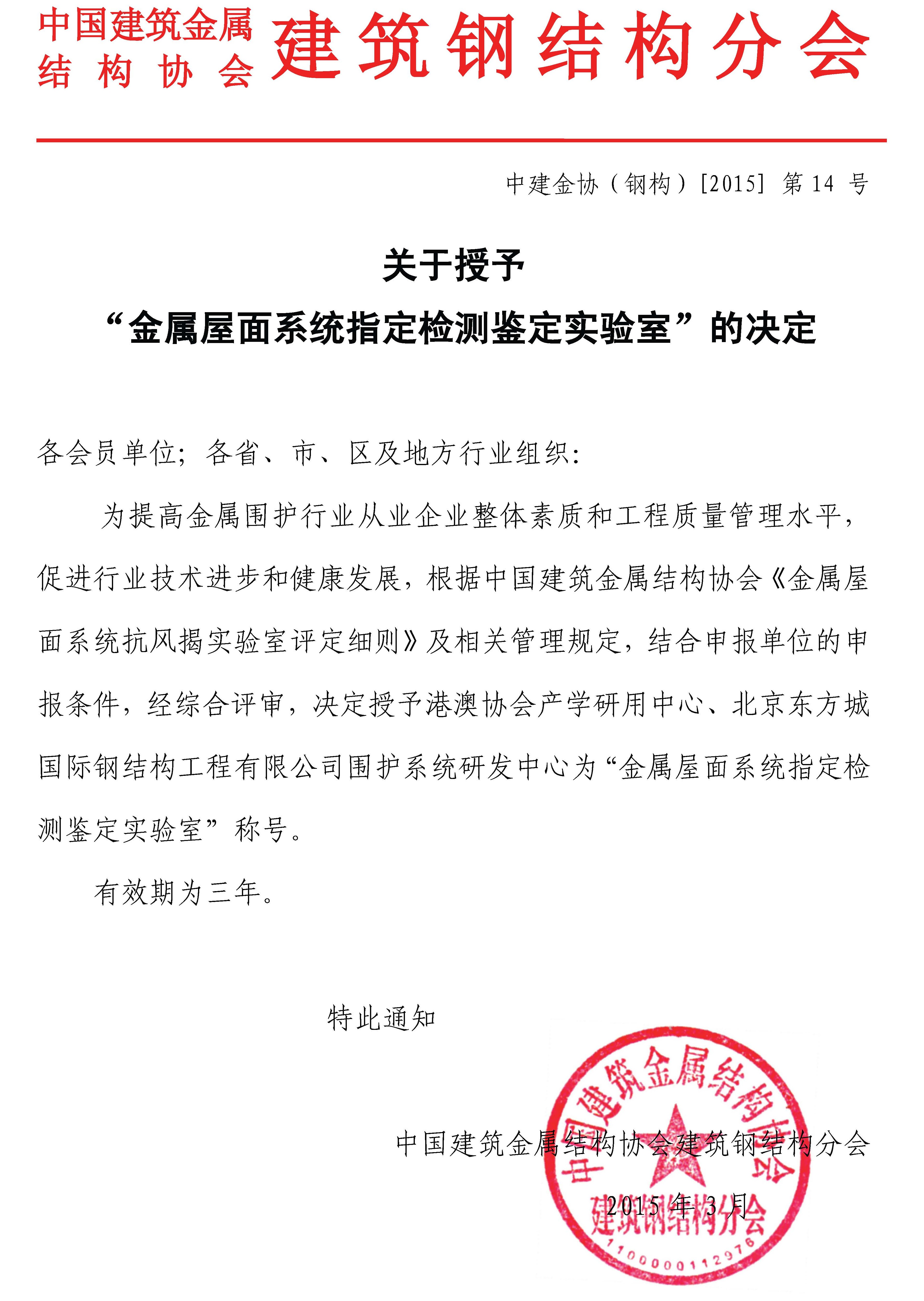 关于授予 “金属屋面系统指定检测鉴定实验室”的决定